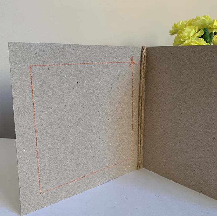 The hessian is machine stitched, using a contrasting thread, onto a plain brown recycled card. This stitching is visible on the inside of the card.