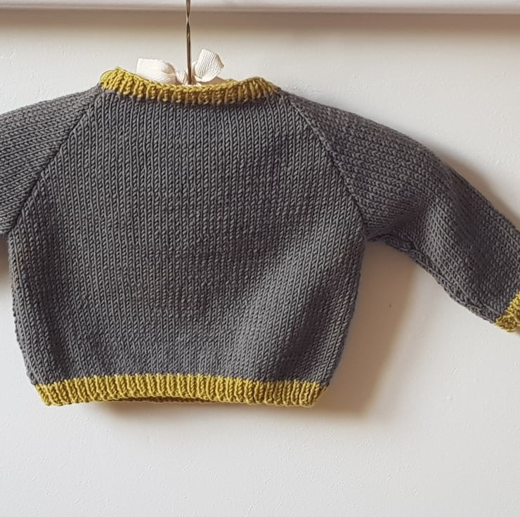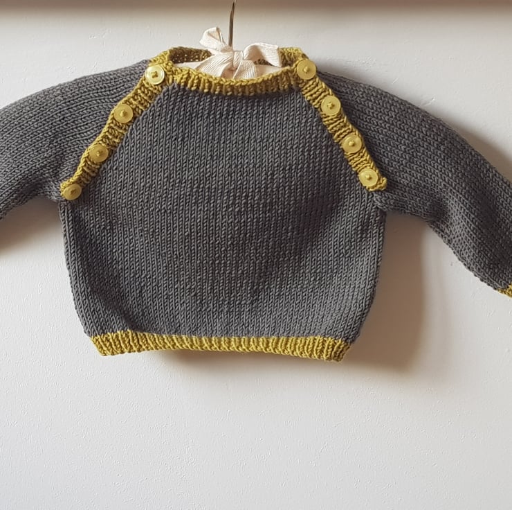 This sweater has been hand knitted in cashmerino baby yarn. The yarn is soft and luxurious and your favourite little one will be warm and cosy in this.