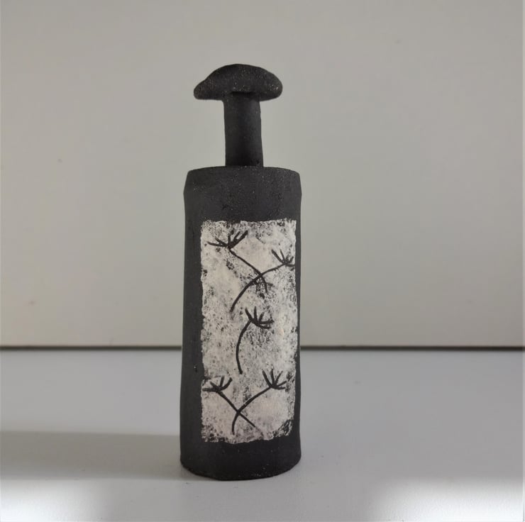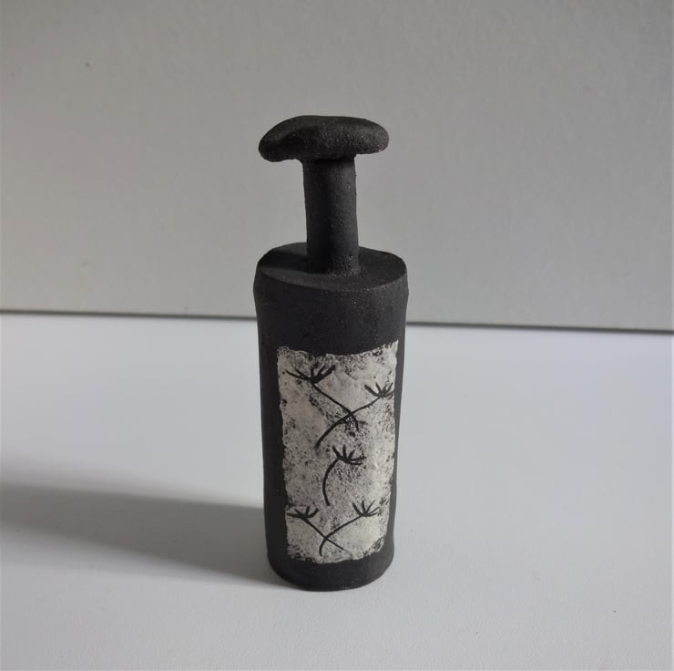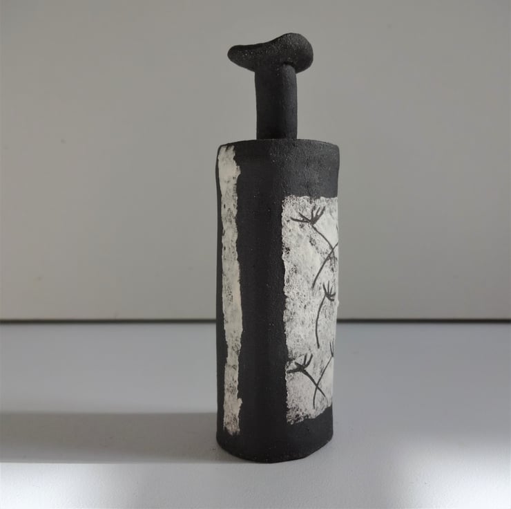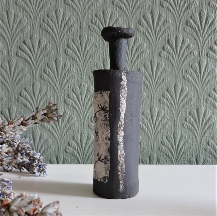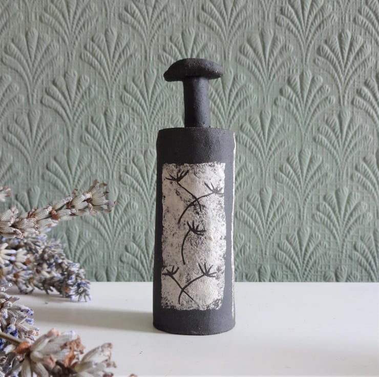 This little bottle is handmade from black stoneware clay, with panels and stripes of white decoration and is an eye-catching addition to your home interior design. I’ve added seed head details on the white panel, inspired by mid century modern textile designs. Tillie is 10cms tall, with a narrow neck and curved top piece – a little like a jaunty hat! The exterior of the piece is in the natural matt black of the clay and decorative white slip. I etch the design through the white slip to expose the black clay beneath – a technique known as sgraffito. A little piece of ceramic art to treasure or give as a special gift.