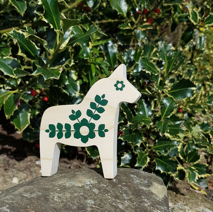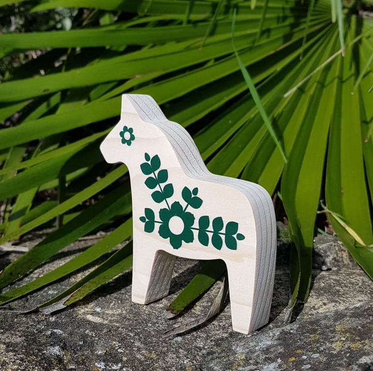 Available with a choice of black, red or dark green vinyl Flowerful decoration, your Dala Horse is individually handcut from PEFC certified Spruce and fine sanded by hand to a beautifully smooth natural wood finish.