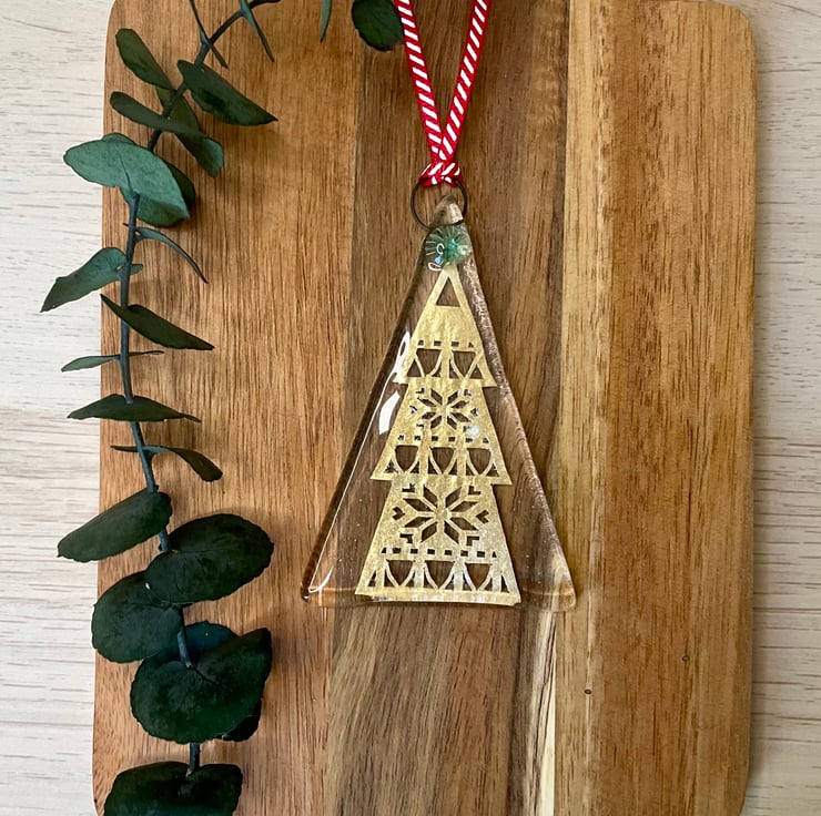 Each decoration is handmade from bullseye art glass and contains a golden tree cut out design inspired by fairisle jumper designs. It has a small metal loop for hanging and a decorative murrini at the top like the star on the tree.