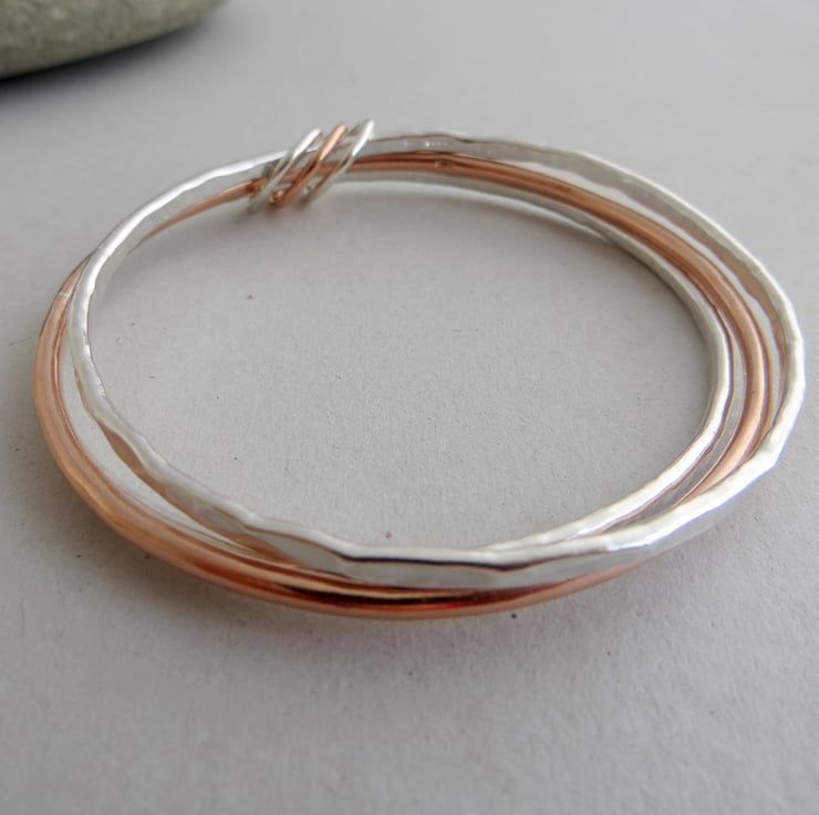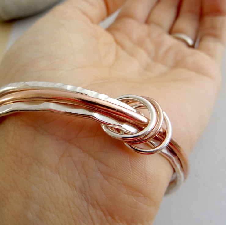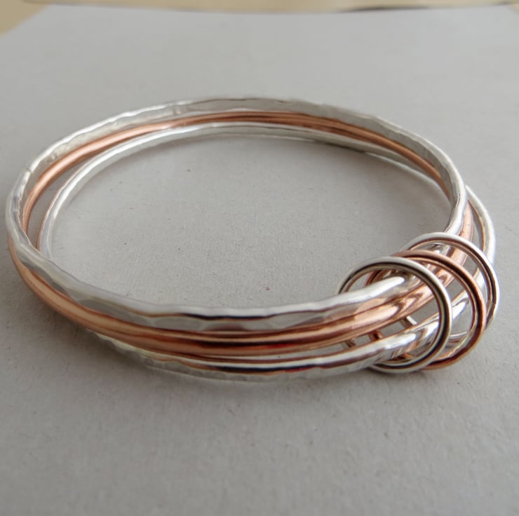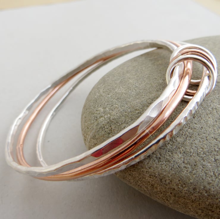 This set of three bangles has been made from heavy gauge sterling silver and copper wire. There are two sterling silver and one copper - each has a different texture to add interest and detail. The bangles are linked together with three rings - again two silver and one copper - and the order of both the bangles and the rings can be rearranged how you choose - perfect for anyone who likes to play with their jewellery!