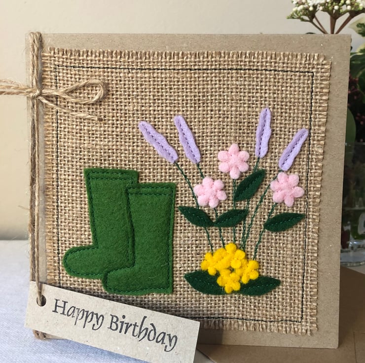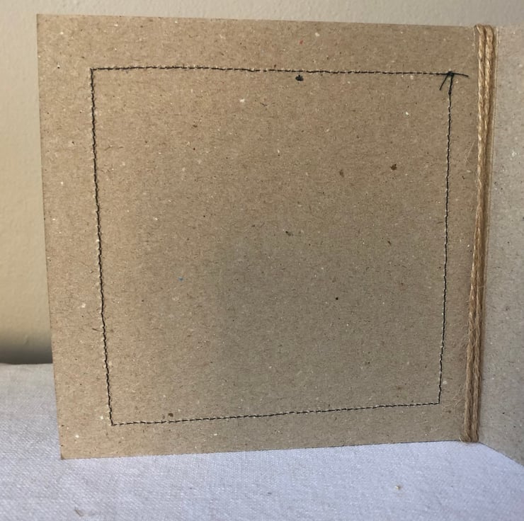The hessian is machine stitched, using a contrasting thread, onto a plain brown recycled card. This stitching is visible on the inside of the card.