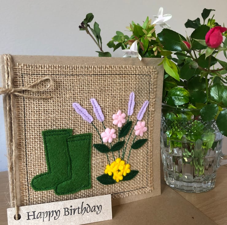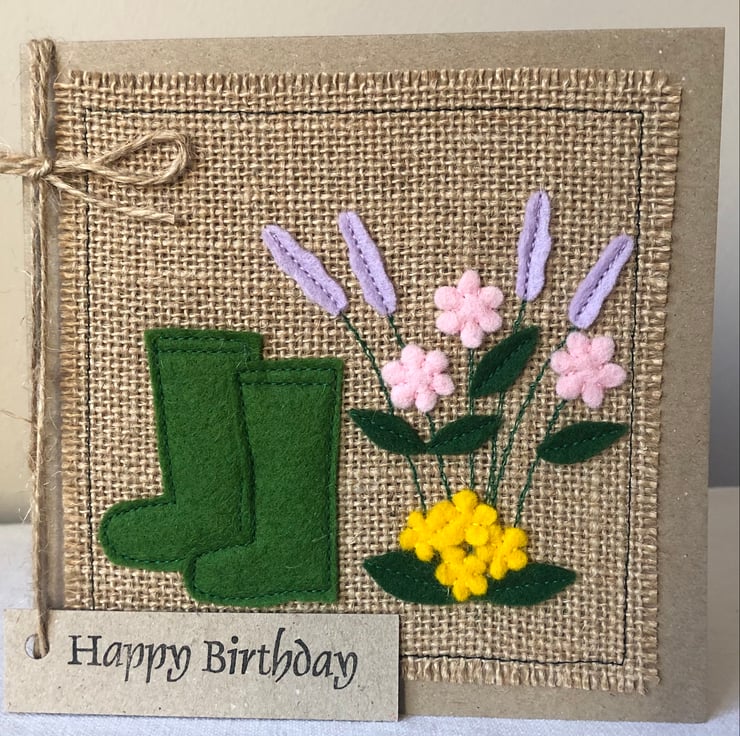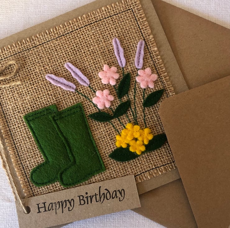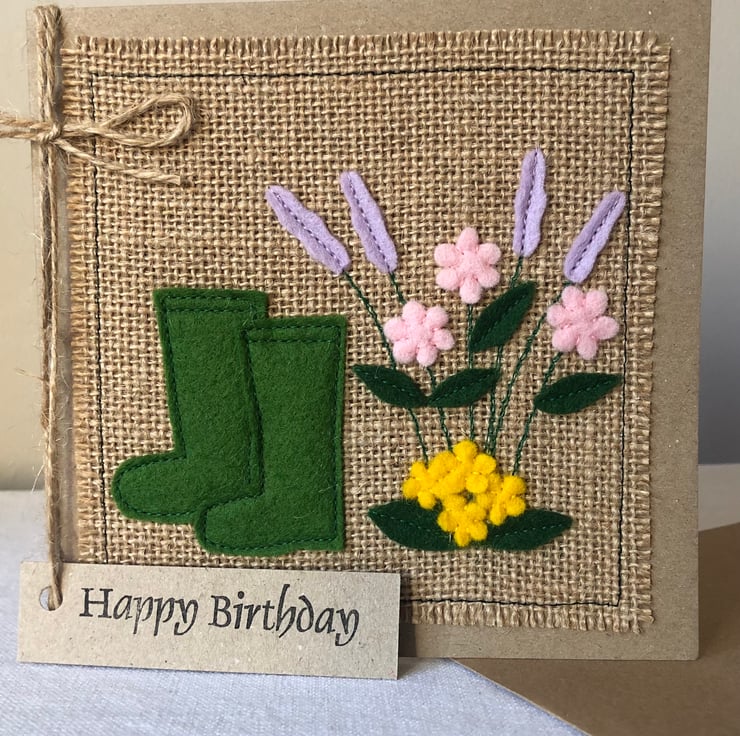 This greeting card is decorated with lilac, pink and yellow flowers next to a pair of dark green gardening boots.
