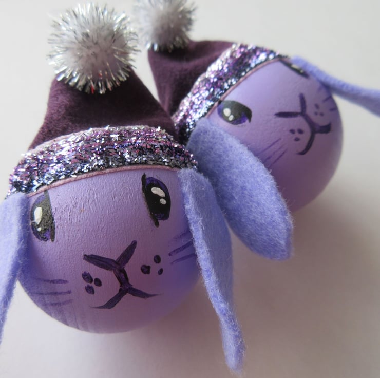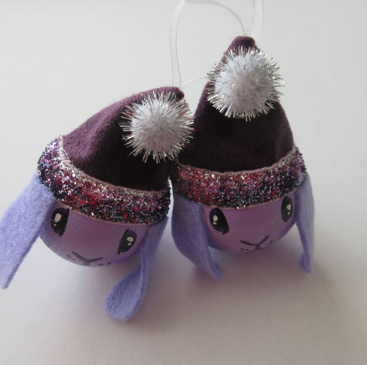 This is a pair of purple themed bunny head baubles, ideal for a purple themed Christmas tree!
