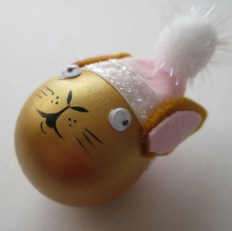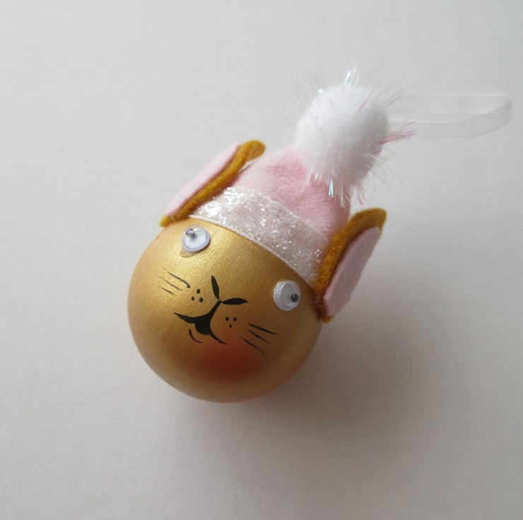 This is a hand painted bunny bauble, made of wood and painted in acrylics. The hat is also hand crafted.