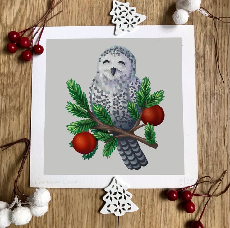 Be one of a select few to own one of these festive Snowy Owl imited edition art prints. Printed on 6" by 6" German etching paper with a 1” white border. Printed to order so can take up to 14 days to arrive. Print is numbered and signed by DuffleCat Prints artist Damian Case. Print is unframed.