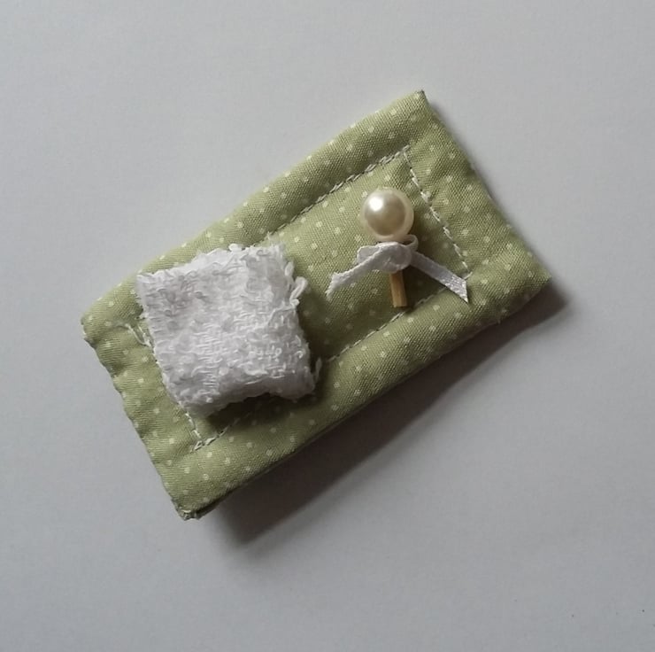 A CUTE LITTLE BABY CHANGING MAT 6cm x 3.5 cm MADE FROM GREEN AND WHITE SPOT FABRIC WITH A TERRY NAPPY AND A TOY RATTLE