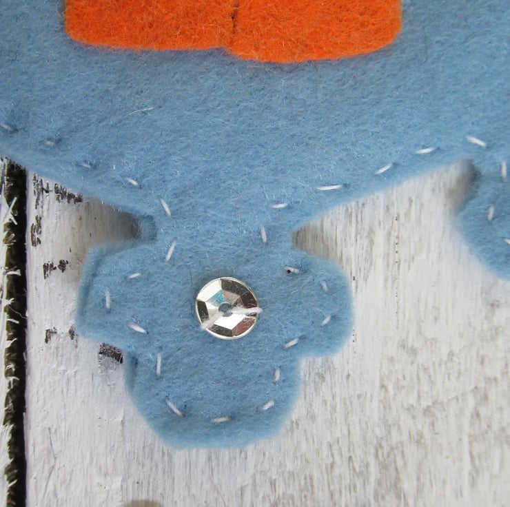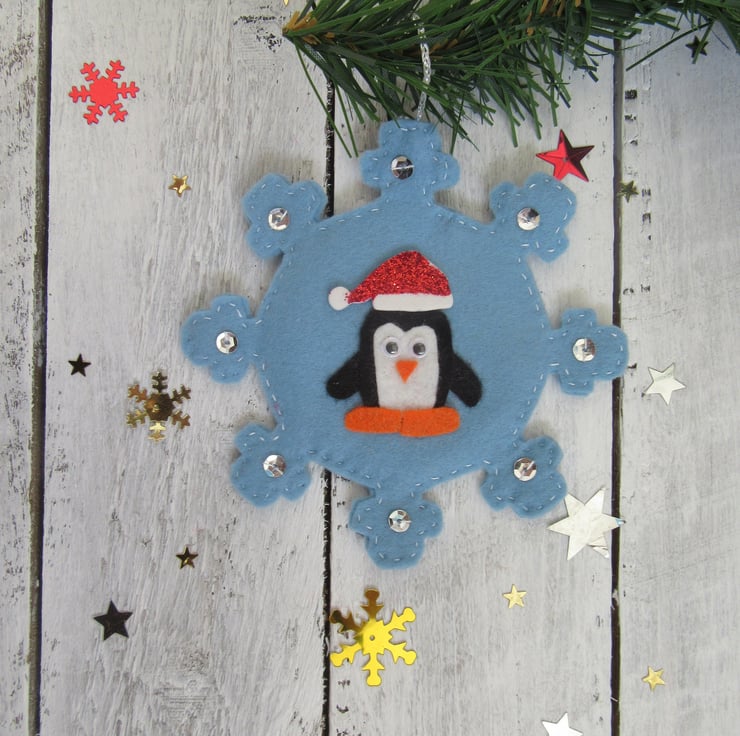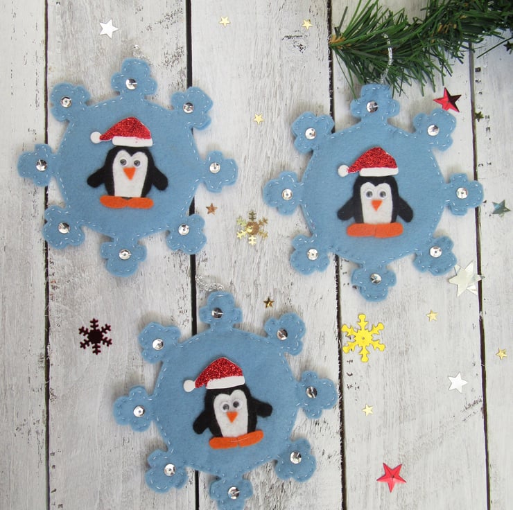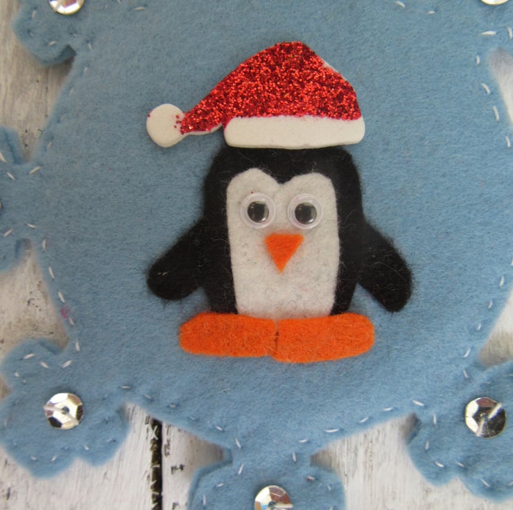 Each penguin is made from black, white and orange acrylic felt with a glittery foam Christmas hat. It is attached to a hand cut and stitched blue felt snowflake with silver sequins hand stitched onto it.