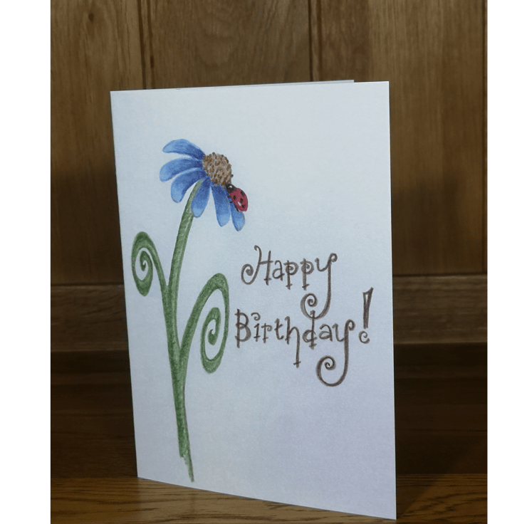 A6 greeting card (105x148mm) with a lovely ladybird on a blue daisy flower design and cheerful Happy Birthday banner. Blank inside for you to add your own message.