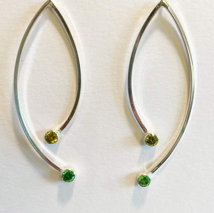 The earring are 5 cms long and have a stud post at the top, the stones are 4mm cubic zirconias in pale and dark green.