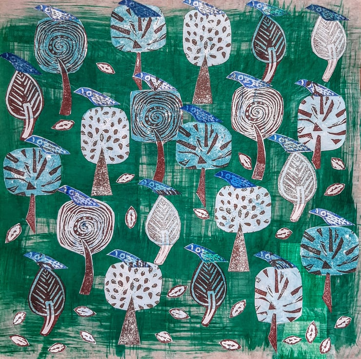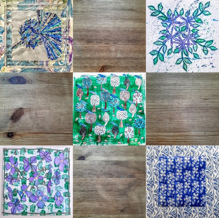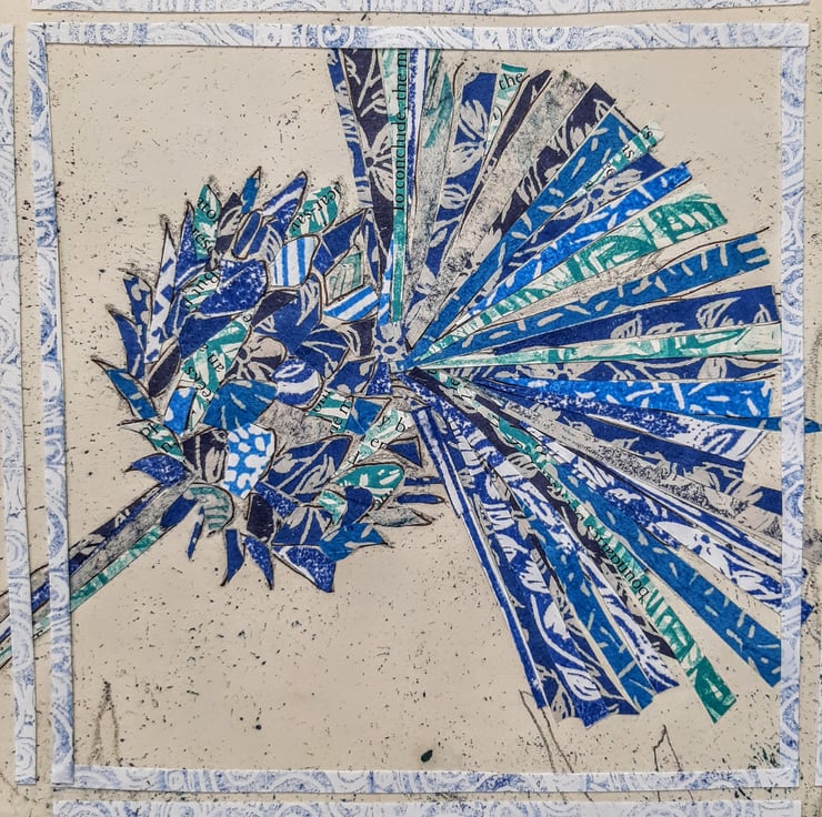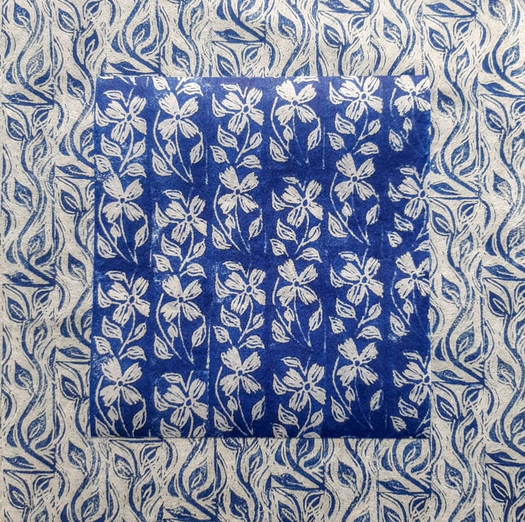 The original designs are representative of my printing or paper collage artwork, where I love creating texture through printing, marbling, cutting and layering.