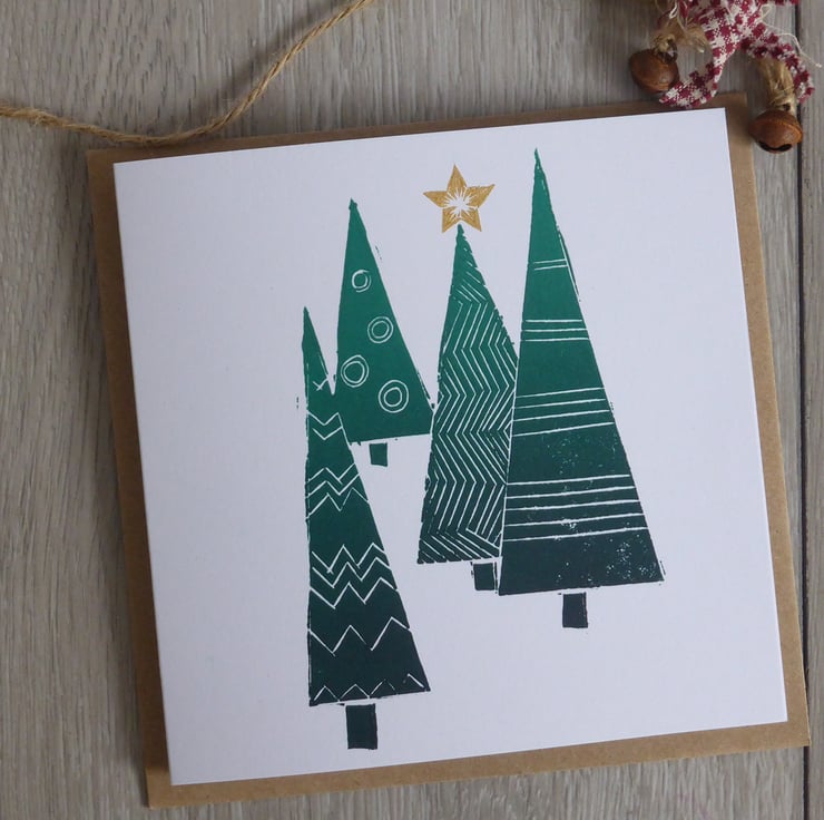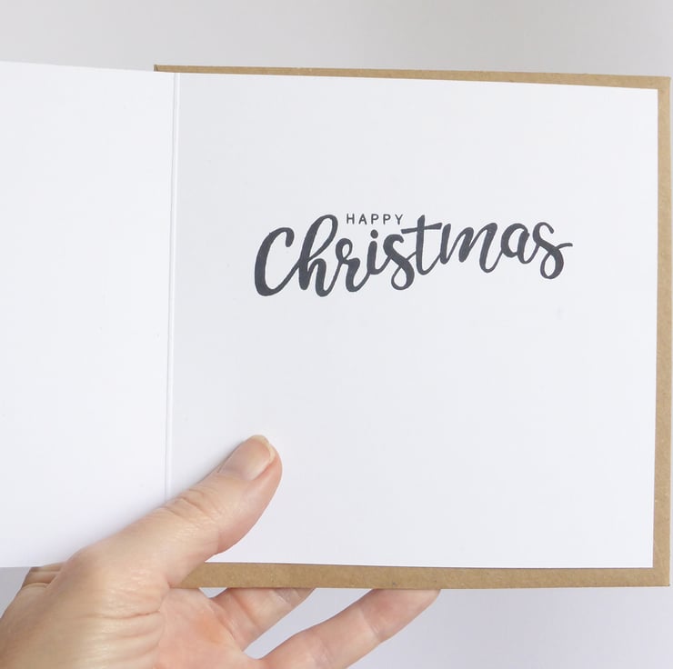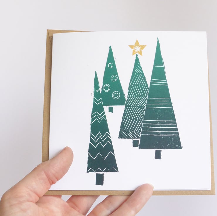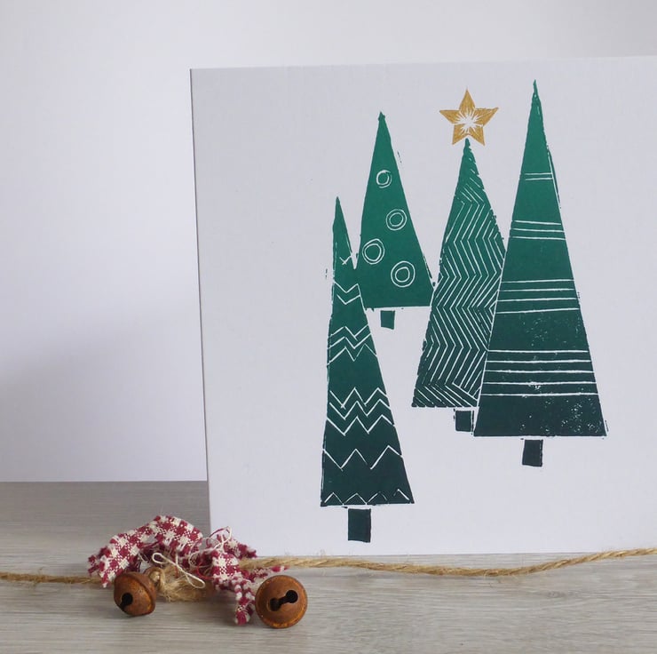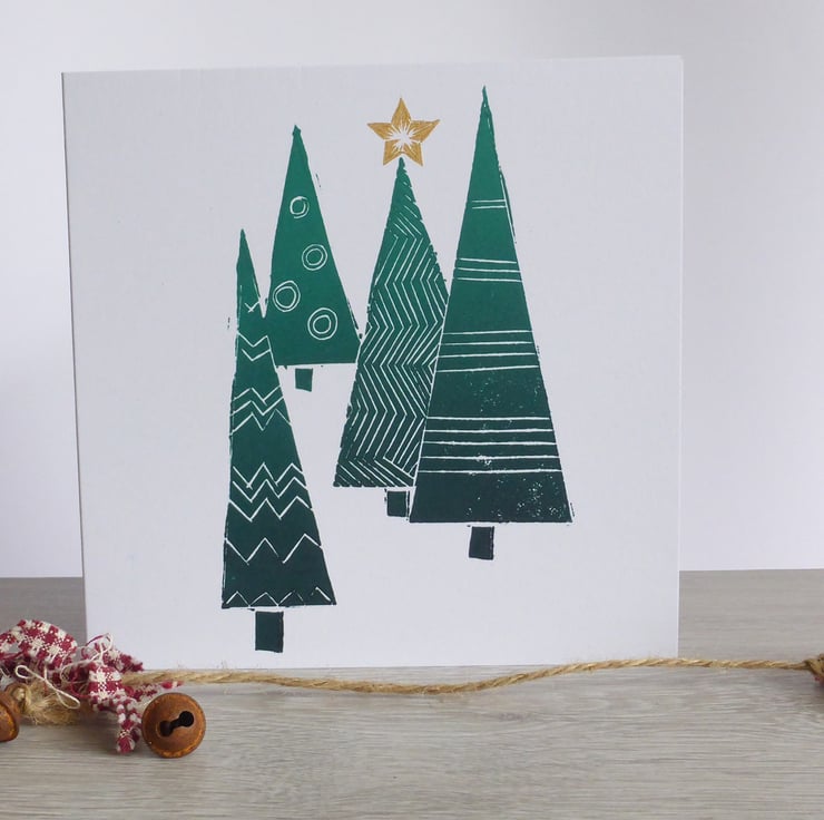 A Christmas card with an original Christmas Tree design created in linocut and printed on 300gsm card stock. The card has Happy Christmas handprinted inside with plenty of space to add your own greetings for friends and family.