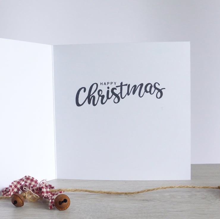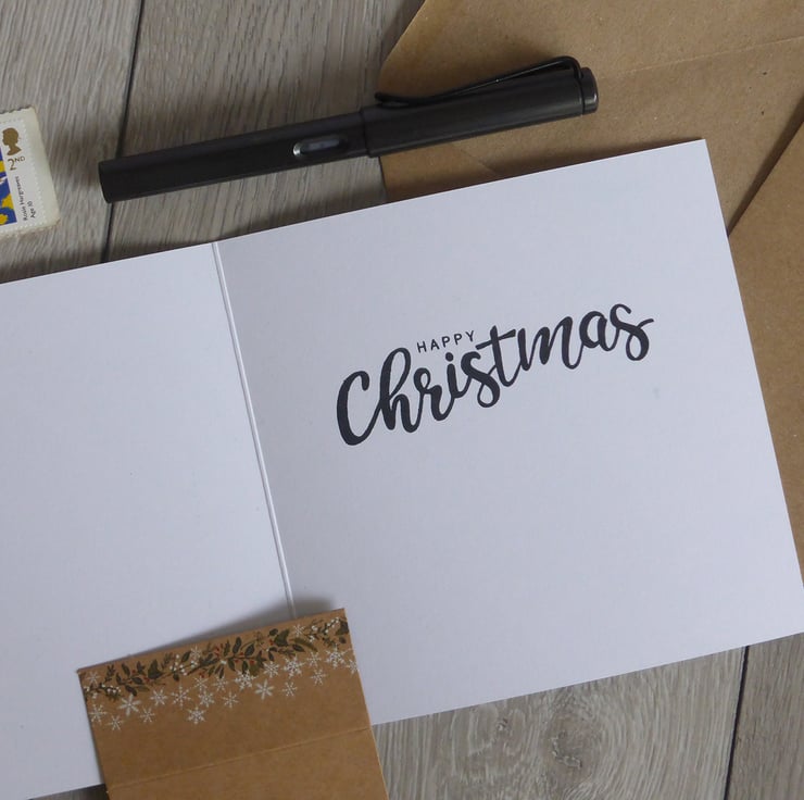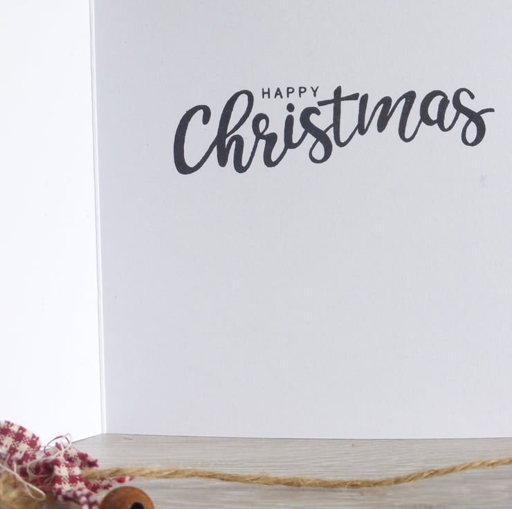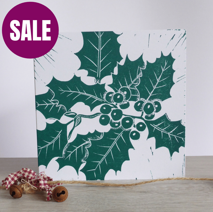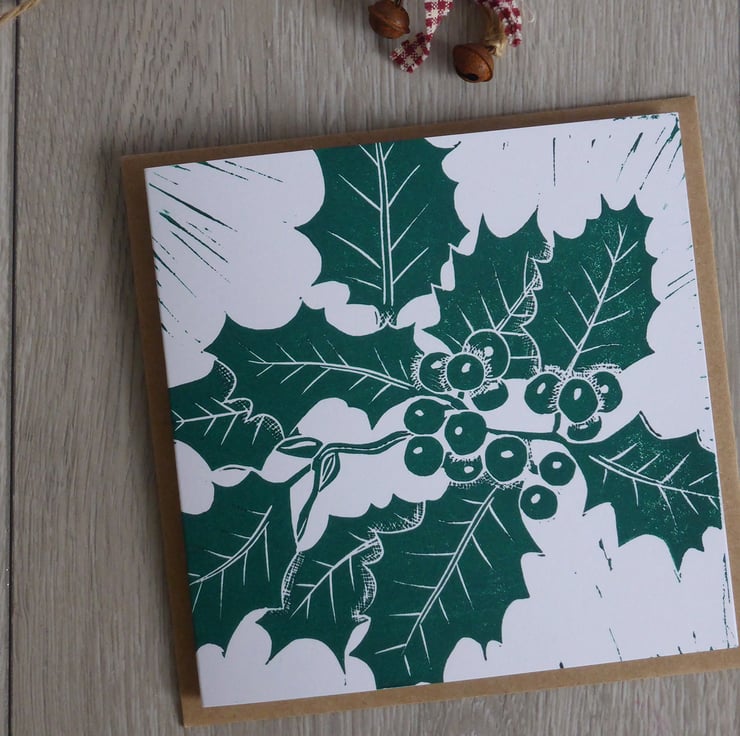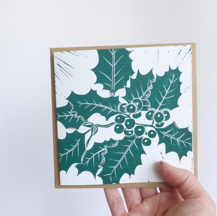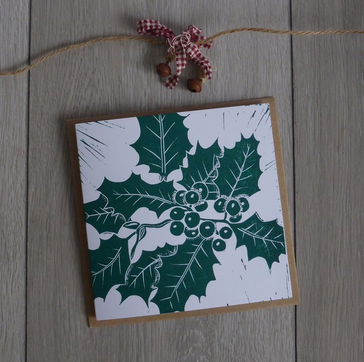 A Green Holly Christmas card, handprinted from an original linocut on 300gsm card stock. The card has Happy Christmas handprinted inside with plenty of space to add your own greetings for friends and family.