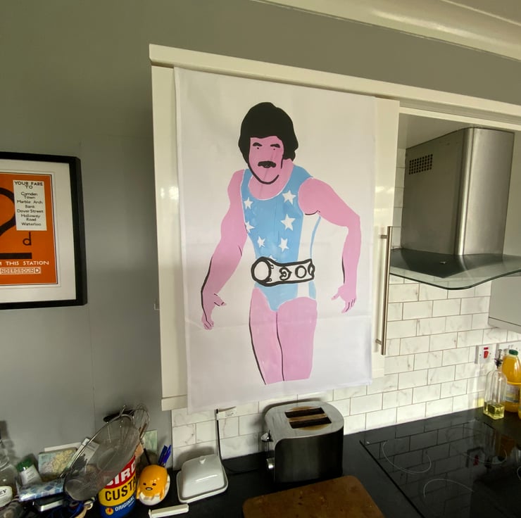It’s the kitchen item you’ve all been waiting for! Rocco the Wrestler in pink and blue and an all cotton digitally printed tea towel.