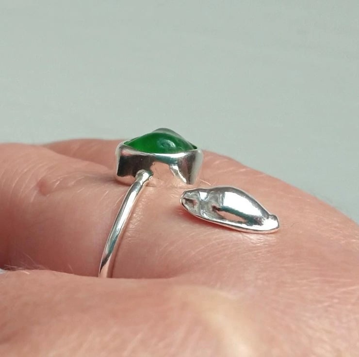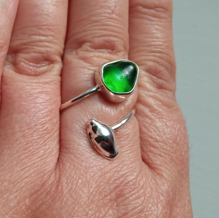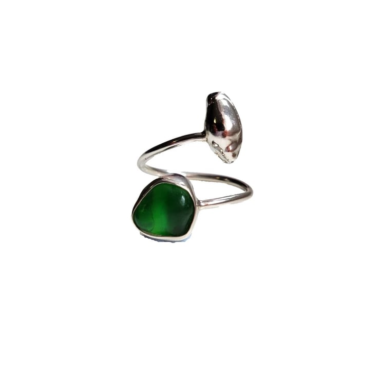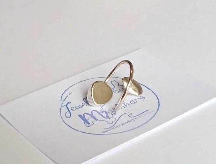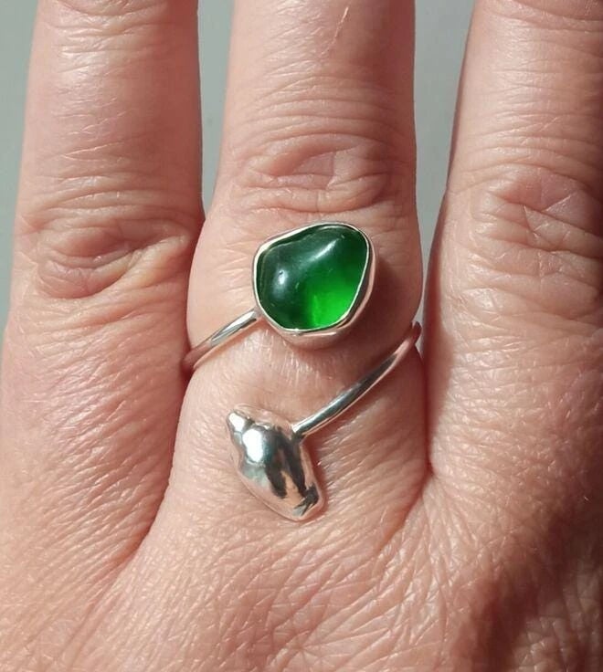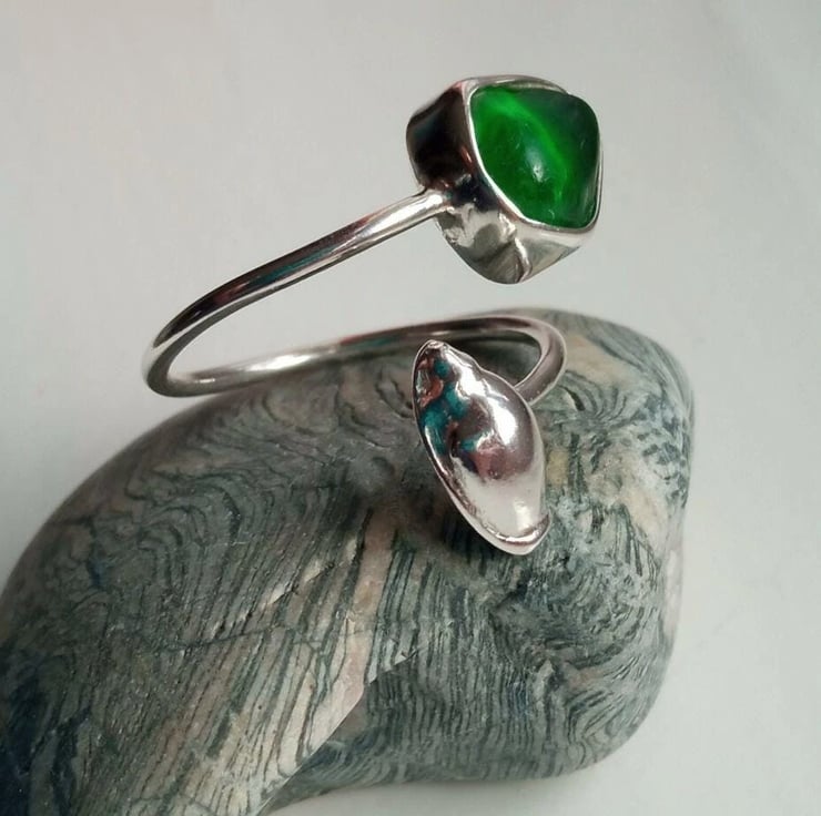 Handmade adjustable recycled silver ring with fine silver seashell & lime green seaglass