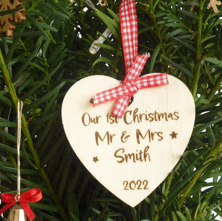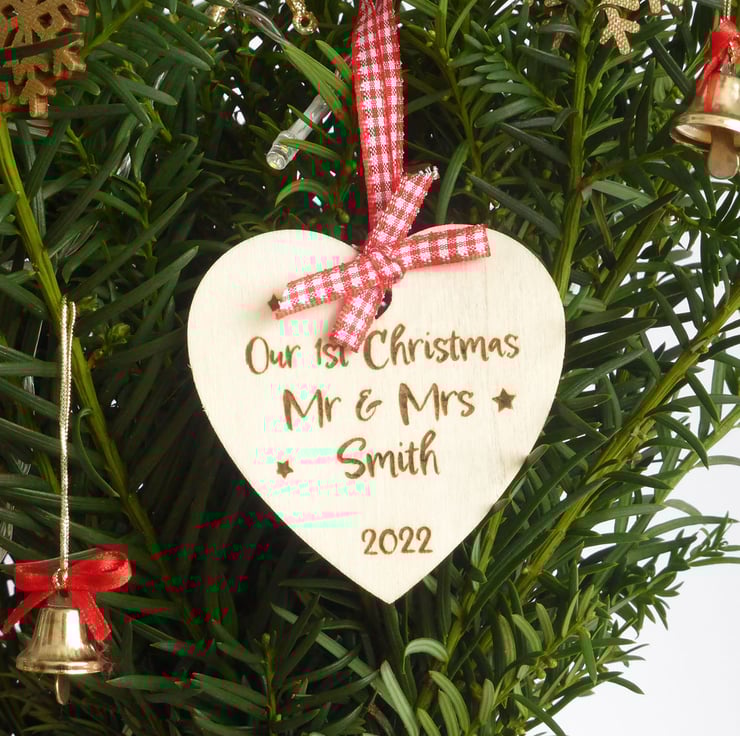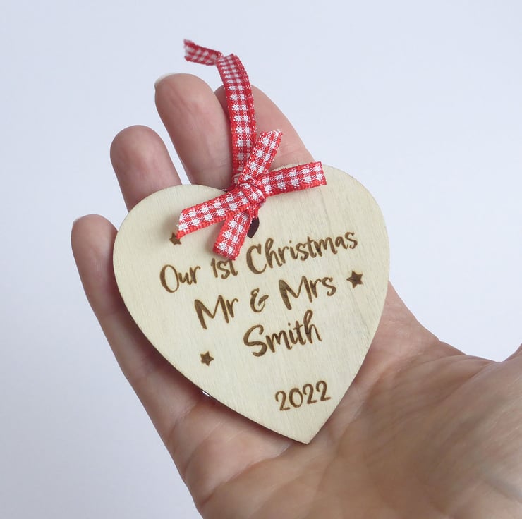 A wooden heart shaped decoration laser etched with 'Our First Christmas' and which can then be personalised with your titles and then the surname of your choice and finished off with a small checked red ribbon, providing a lovely little personalised Christmas gift for your husband, wife, a special friend, loved one or partner and ideal to pop in to a Christmas box or stocking.