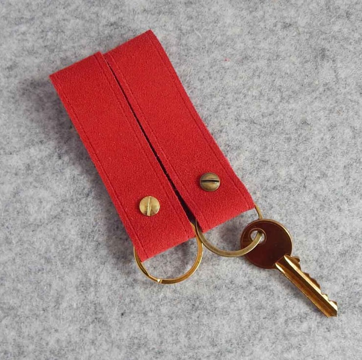 Handy key fob and keyring in bright red suede leather.