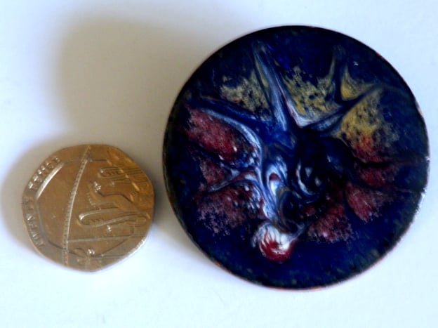 I added layers of clear enamel and then a single layer of dark blue to the copper disc that forms the base of this brooch. I then scattered red, white and gold on the blue, added a small red and white millefiore bead and drew a steel tip through the surface of the red hot enamel to generate the unique, random pattern you see.