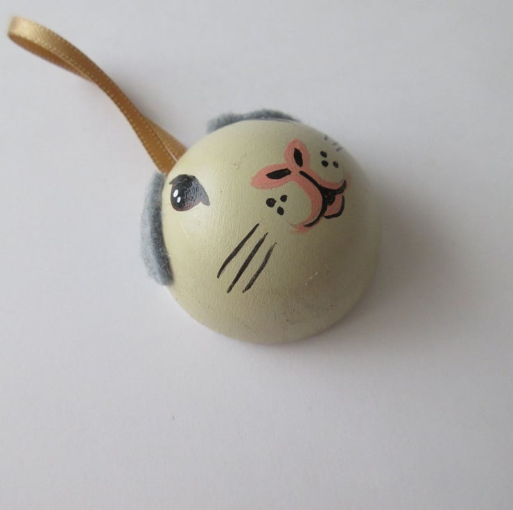The guinea pig is painted in acrylic paints with felt ears and felt backing on the flat side of the wooden ball.