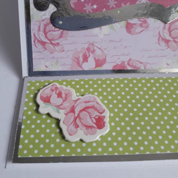 Under the sentiment topper are two panels of rose patterned paper on silver card, there is a strip of the spotted paper as a stopper with a die cut rose embellishment to the left side and three tiny butterflies to the right, the base card is white.