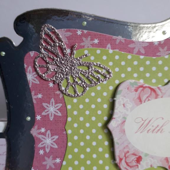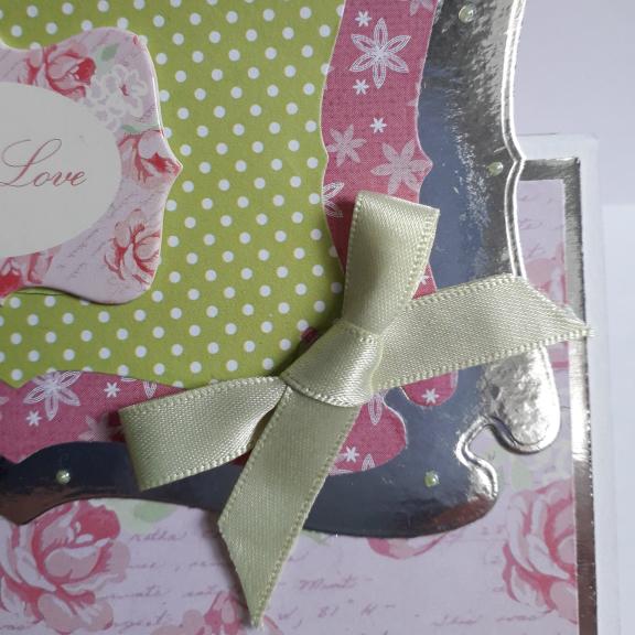I have placed the sentiment onto shaped panels of green spotted and pink floral patterned papers, then silver card, There is a glittery pink die cut butterfly to the left side of the sentiment and a light green bow to the right, I have also added tiny green pearls around the silver card.