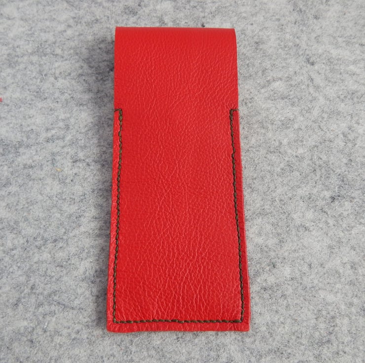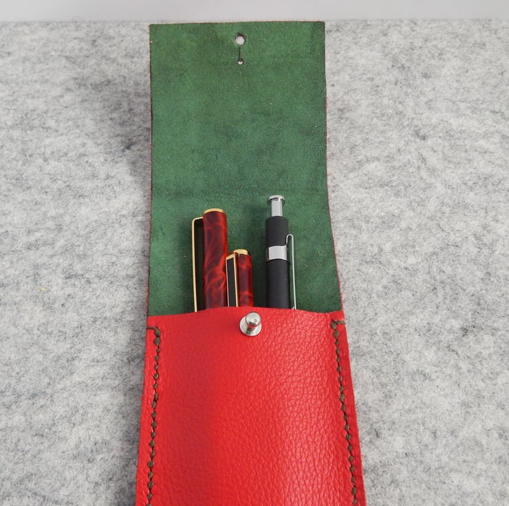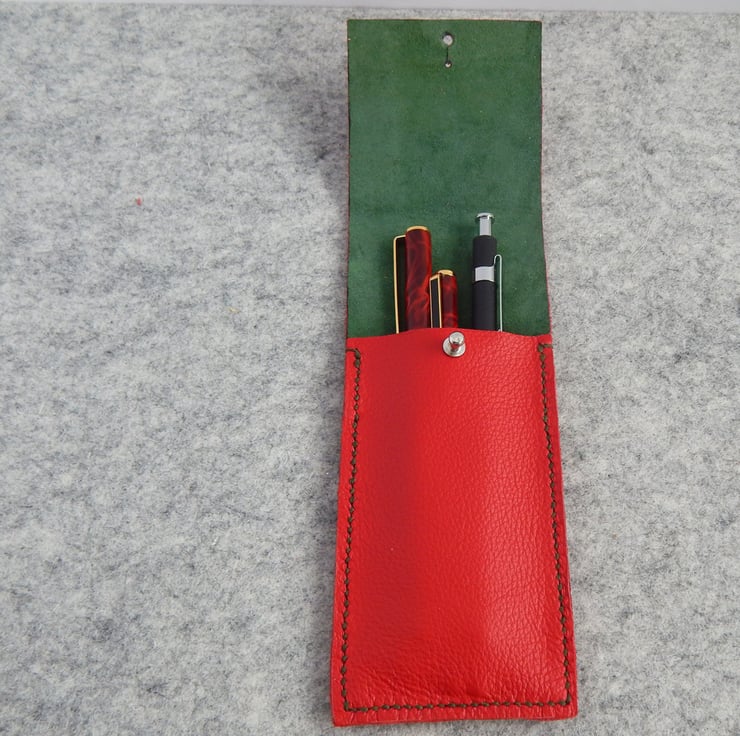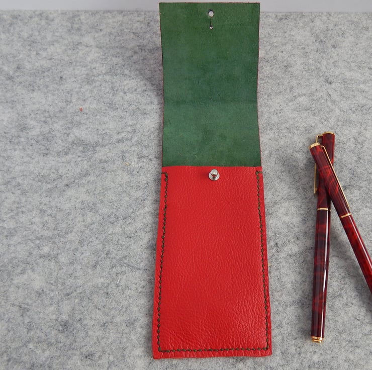 Pen or Pencil Case in bright red leather, with a luxurious green suede lining.