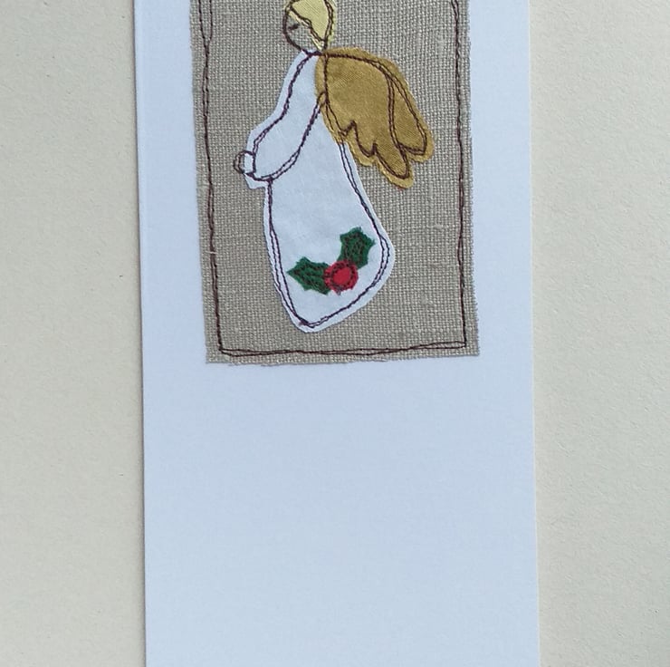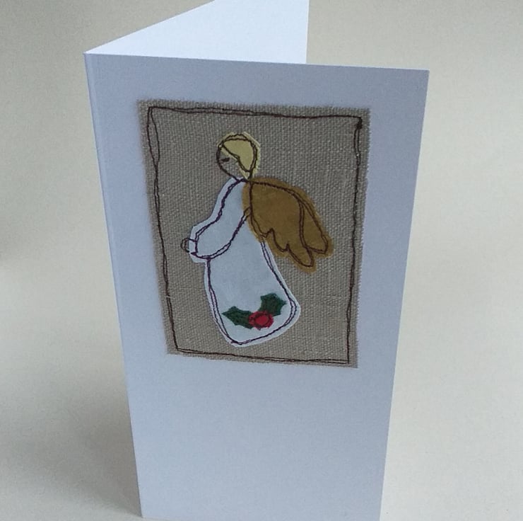 A sweet Christmas card featuring an angel, made using appliqued fabric, which is stitched in free motion embroidery on to linen. The embroidery is then sewn straight on to the card. The angel has lovely gold wings and a holly detail on her gown.