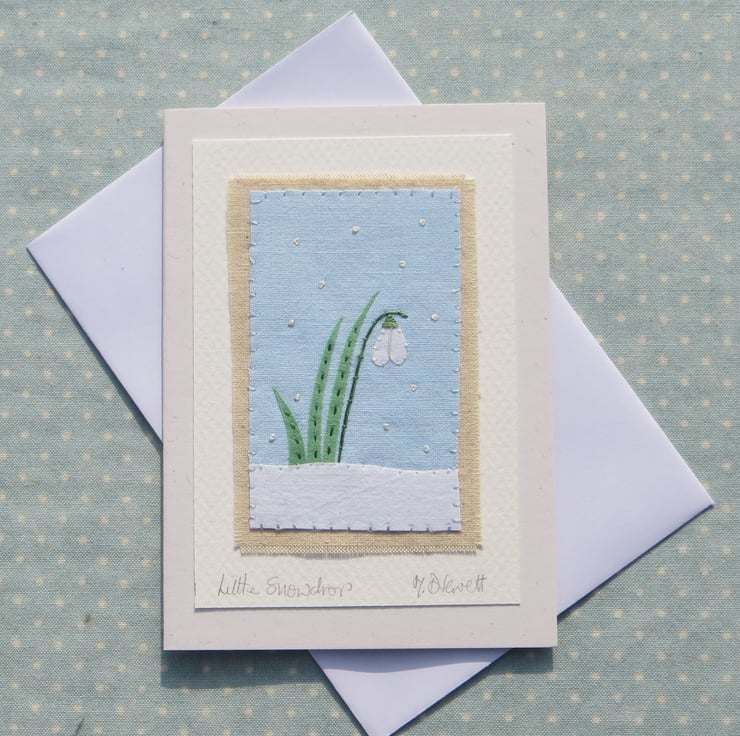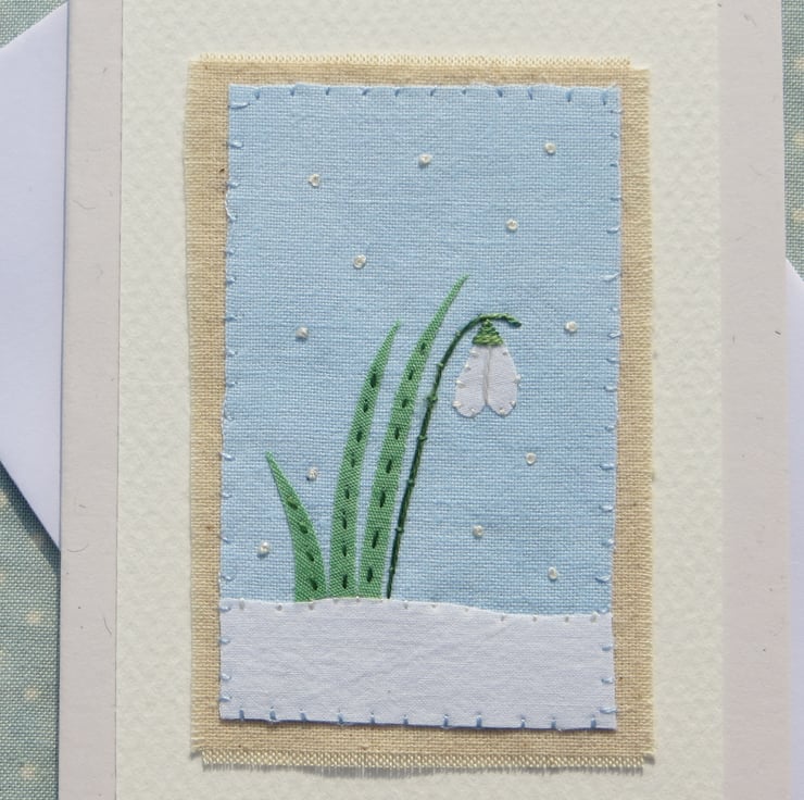 A miniature hand-stitched applique snowdrop in snow made from hand-dyed recycled cotton with intricate top-stitched details. Perfect for January or February birthday, or any winter occasion, definitely a card to keep!