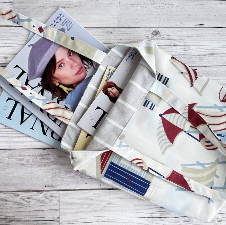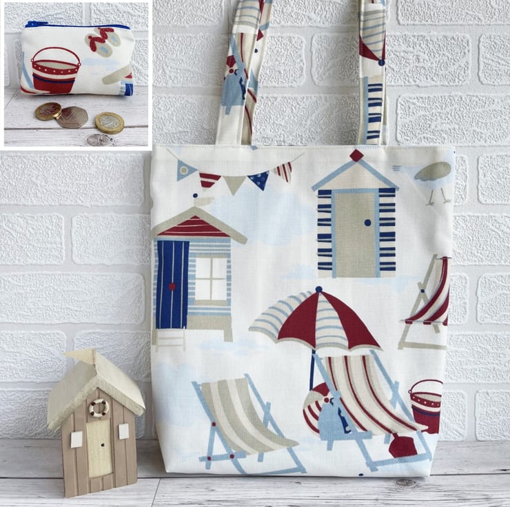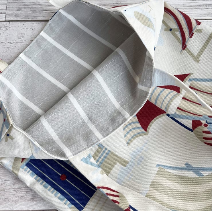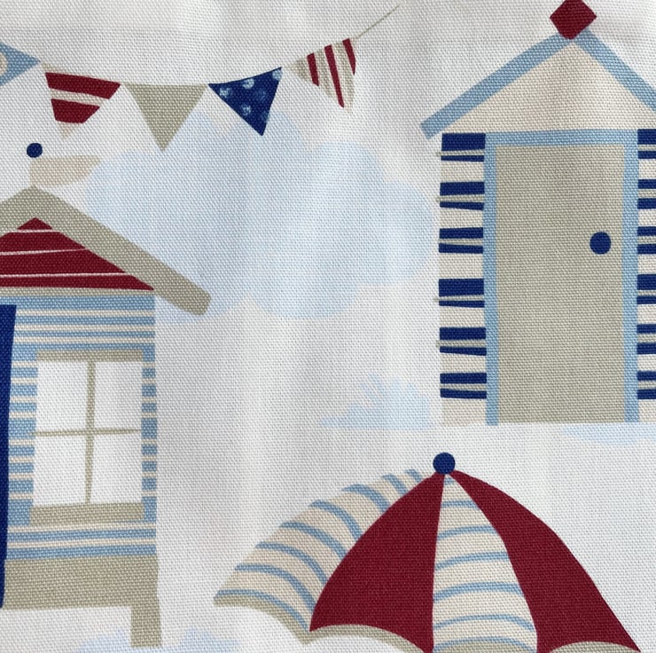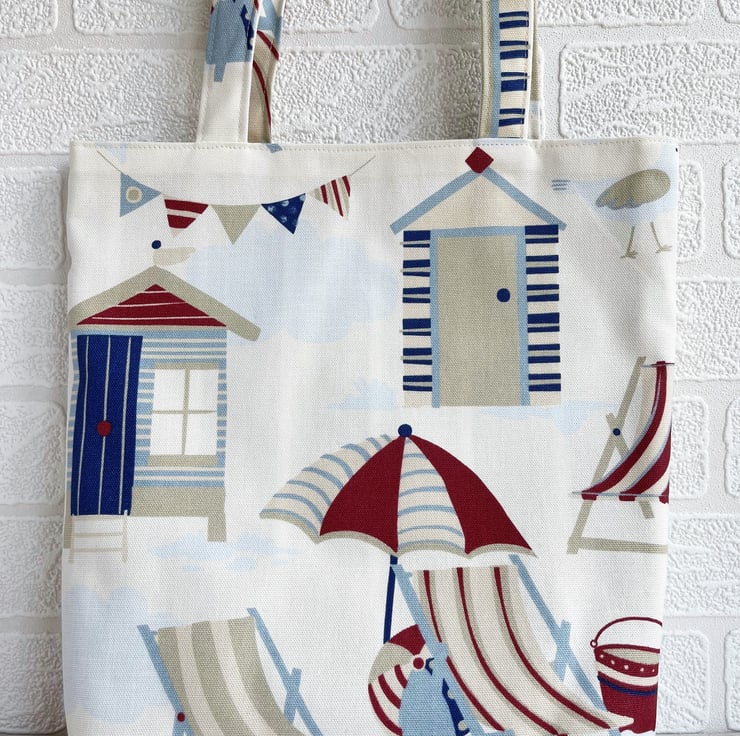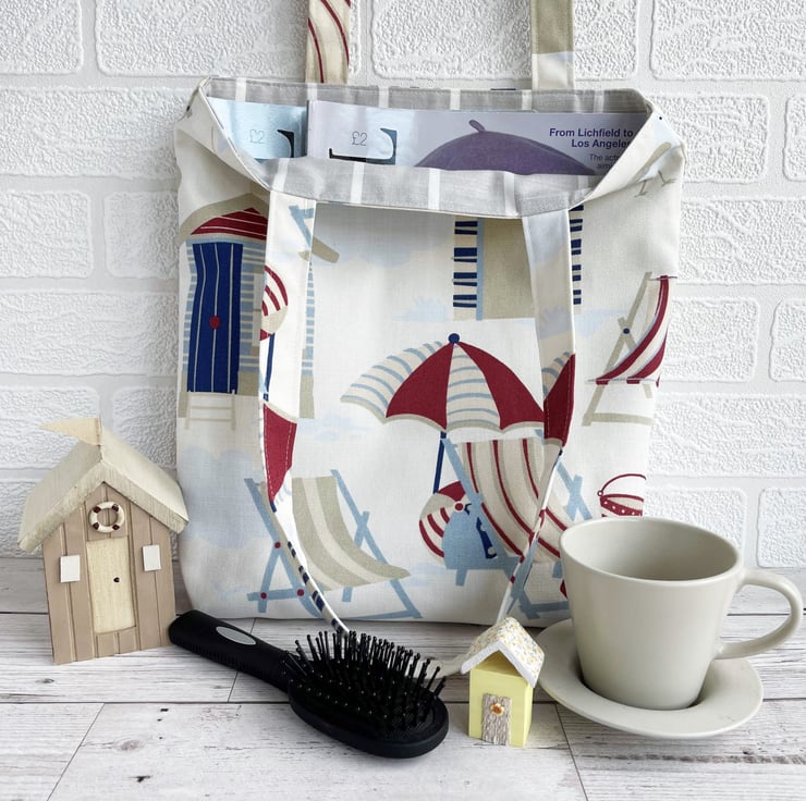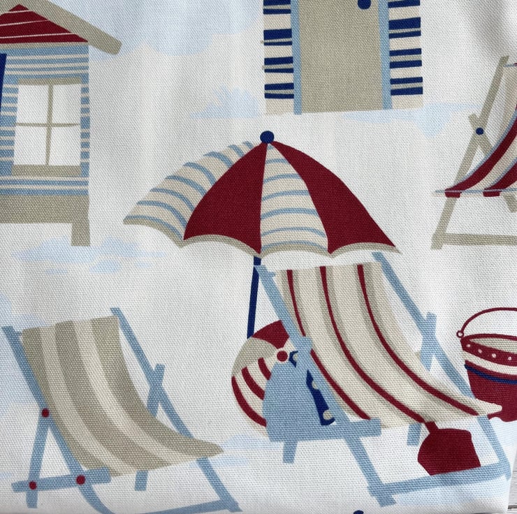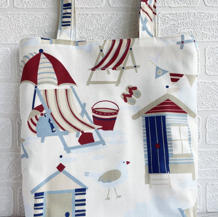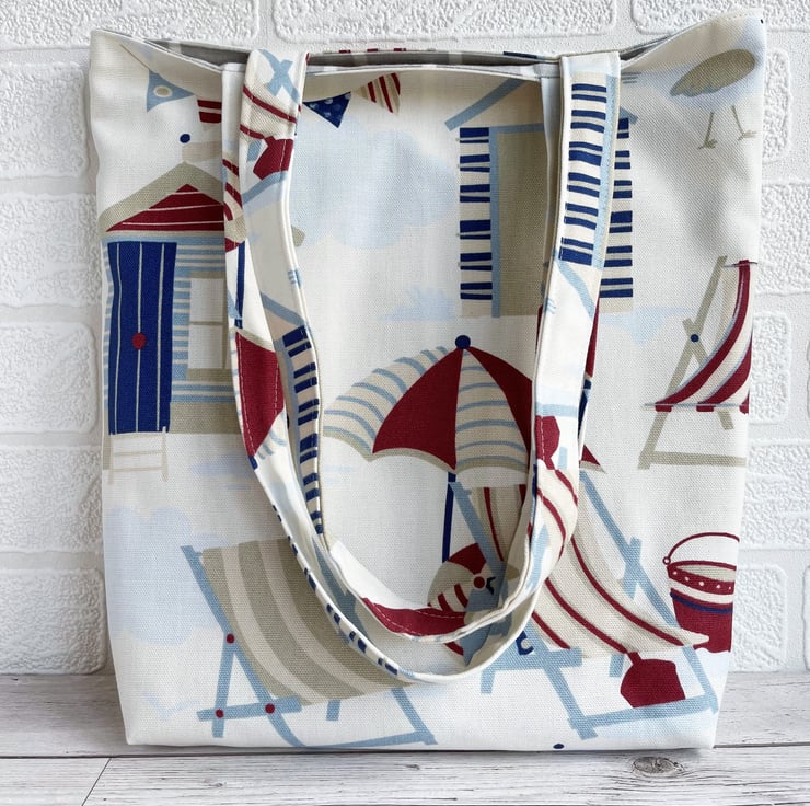 Seaside tote bag with beach huts and deckchairs. This lovely tote bag is made from print fabric with a delightful seaside pattern in nautical shades of blue, red and beige on a cream background. The pattern features beach huts, deck chairs, a parasol, bunting, a beachball, bucket and spade, and a cheeky seagull. The bag is lined with nautical-style fabric in pale grey with narrow white stripes.