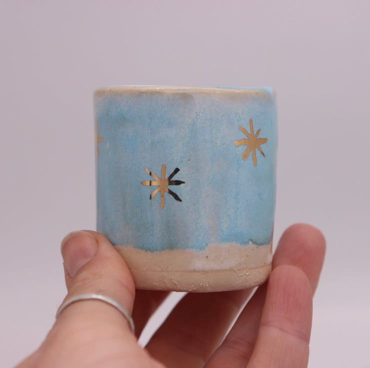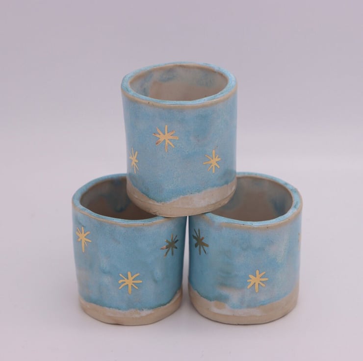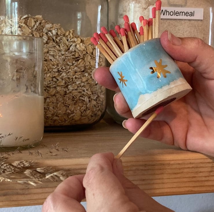 Handmade matchstick holder, with light blue glaze and 22 carat gold lustre star detailing. made in Cornwall from Stoneware.