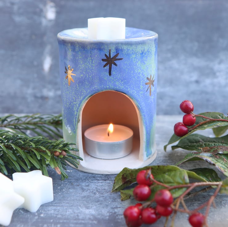 my Winters Night starry glaze which has a 24 carat gold lustre starry detail and hues northern light green to the sky (note from the photos the blue in the starry night isn't a solid blue and often the glaze takes on a green blue look a bit like the Northern Lights.