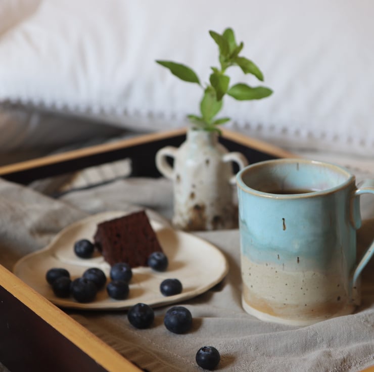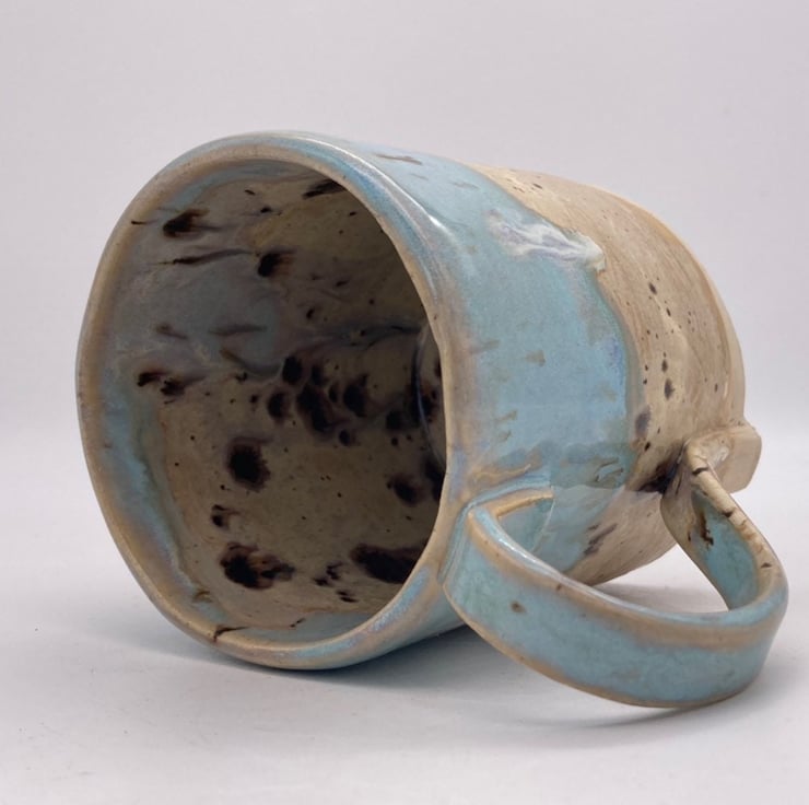 I roll the clay and form the mug in slabs. I hand form the mug and allow to dry for a week before it receives its first firing (bisque firing), I then start the glazing and then refire slowly to 1220 Celsius.