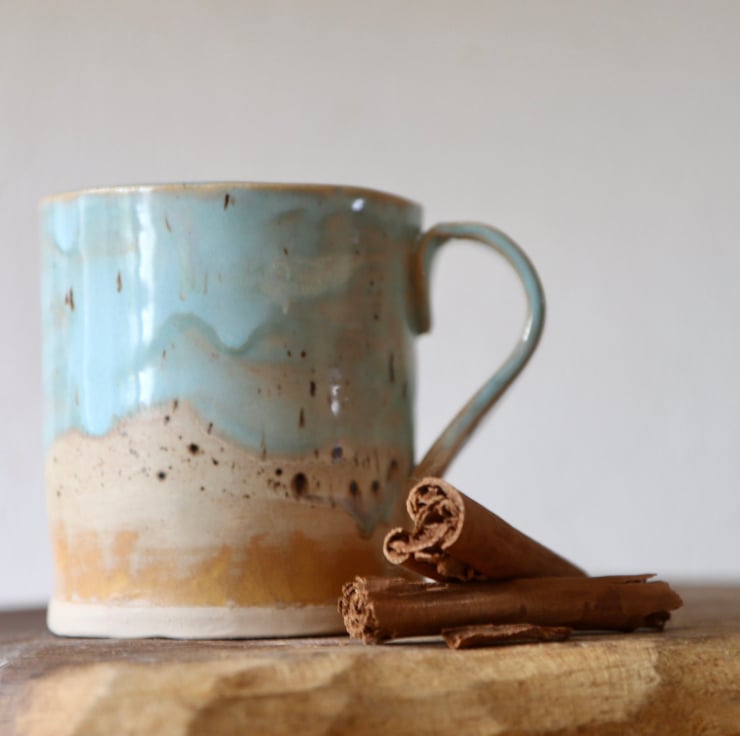 Each mug is hand formed with slabs in a beautiful speckled stoneware clay. The glazes are the result of much experimentation to create dramatic landscape scenes.