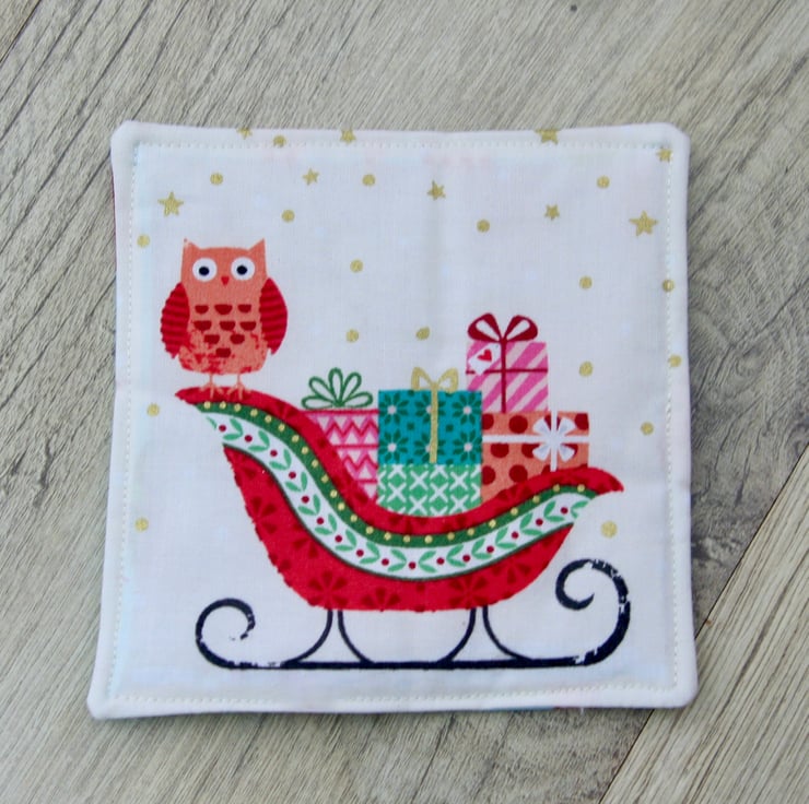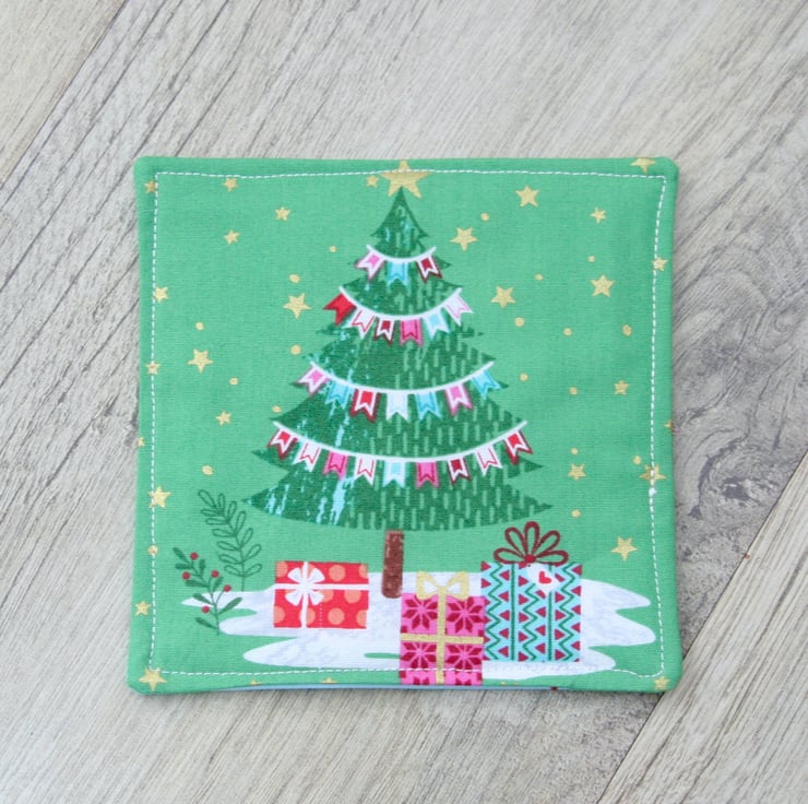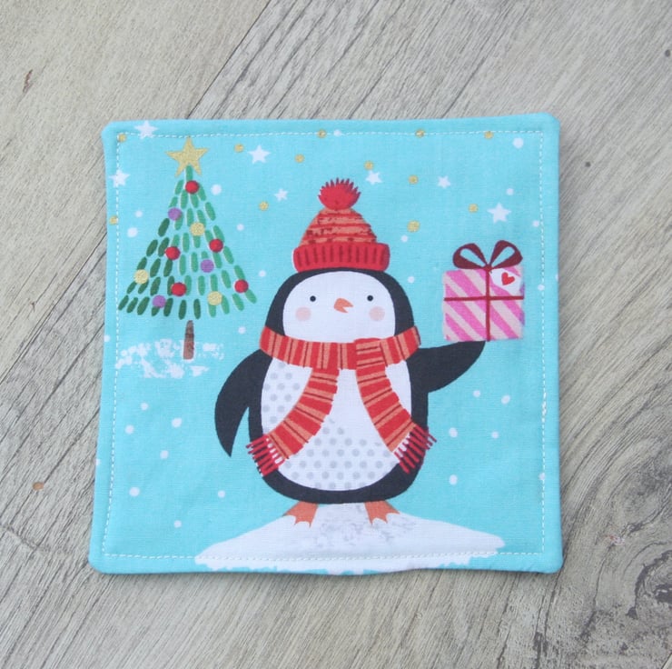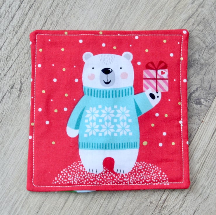The main material is 100% high quality cotton each featuring a different festive picture, a Polar bear holding a present, a Penguin also holding a present, a festively decorated Christmas trees with brightly wrapped Christmas presents and a sleigh laden with Christmas presents. They are backed with a light blue 100% high quality cotton, with a pattern of Christmas Trees. There is a layer of polyester eco-friendly wadding in the centre made from recycled plastic bottles. The layers are stitched together, with a layer of top-stitching around the edge.