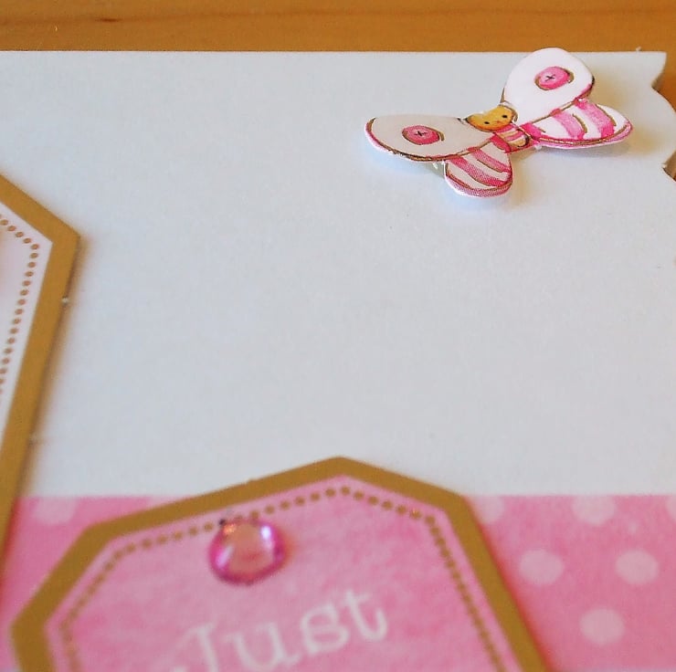 The white card base has a scalloped edge and I've added a pink spotted paper ribbon across the middle before placing the base layer of the topper towards the left side of the card. The topper features an image of a little girl unwrapping a present that contains a cuddly bunny toy, the image has been layered to make it 3D. To the right of the image I've placed a tag with a pink butterfly on it and the words "Just For You" and added a pink faux gem to the top, in the top right corner I've added a pink butterfly that matches those on the main topper.