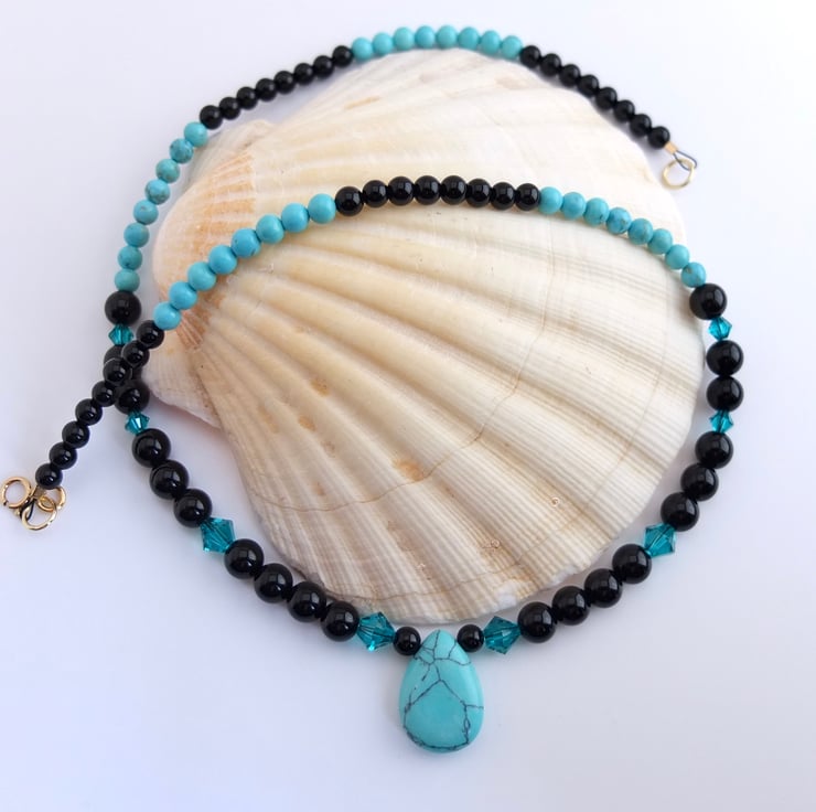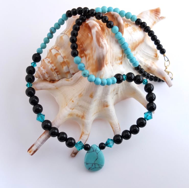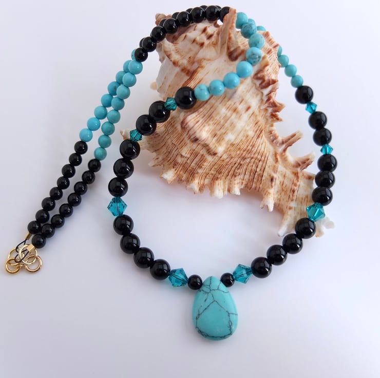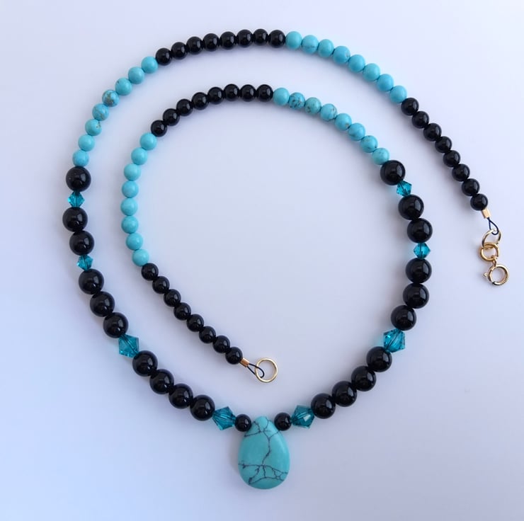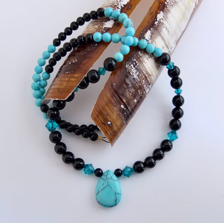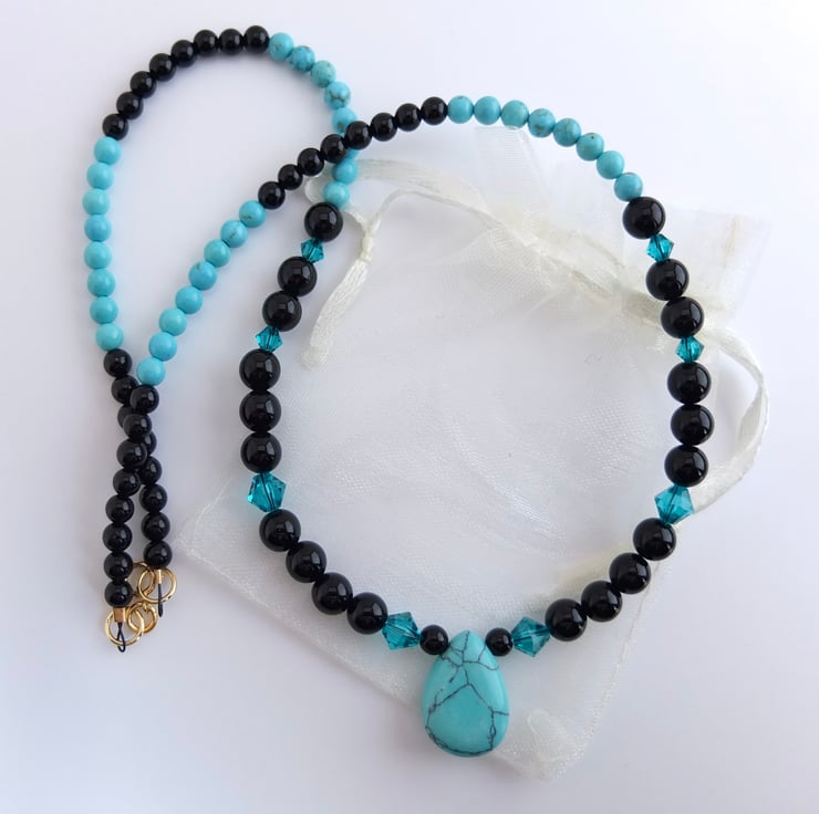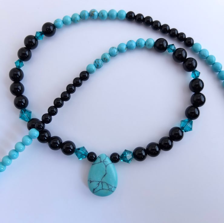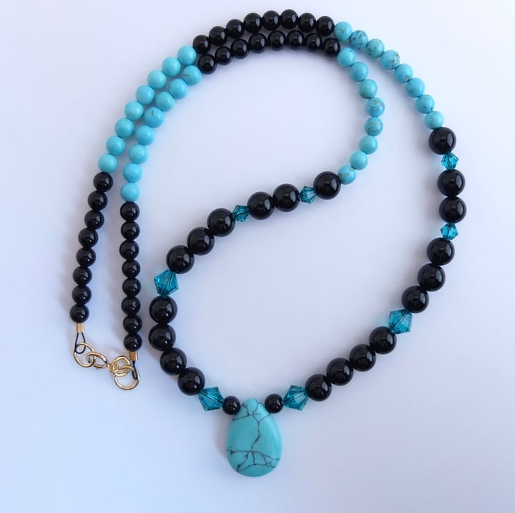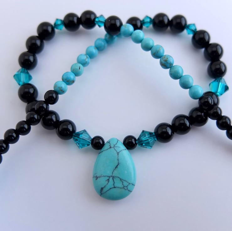 The 18mm x 13mm turquoise howlite teardrop pendant hangs between 6mm shiny black onyx beads dotted with sparkly Swarovski "blue zircon" 4mm and 6mm crystals.