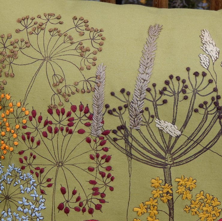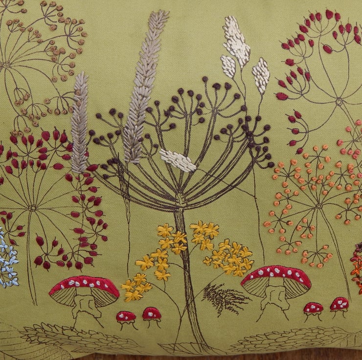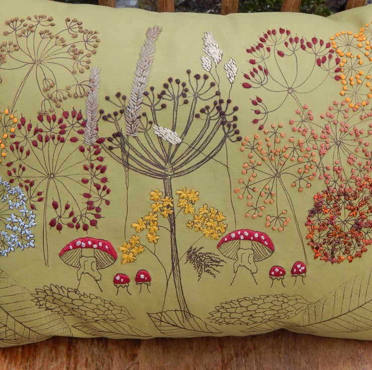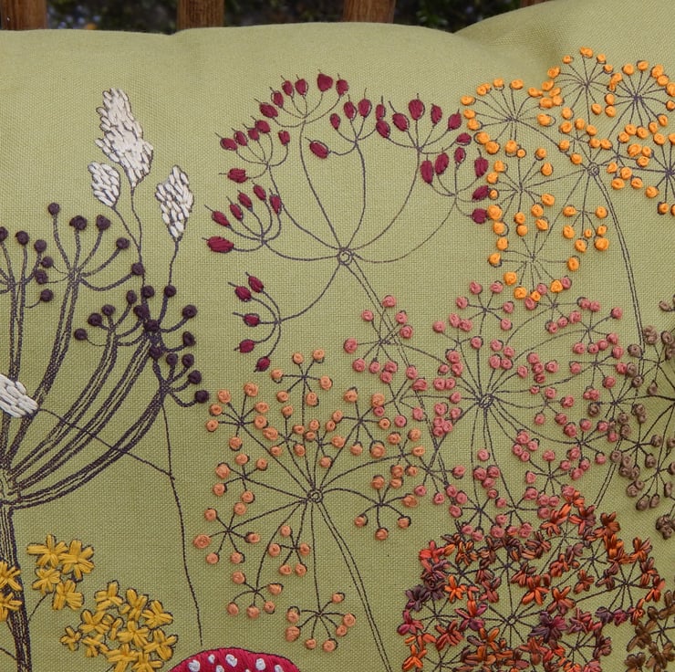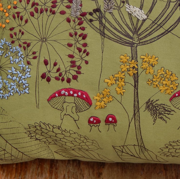 This is an olive green heavy weight cotton cushion that has been screen printed with my own designs. Many have been individually printed which involves positioning, printing an individual flower, drying and then repeating. This gives you an absolutely one off, designed cushion. Many of the flowers are then hand embroidered to lift the petals from the fabric and give a pop of life and colour.