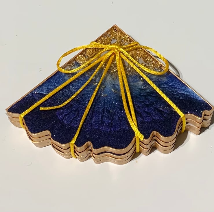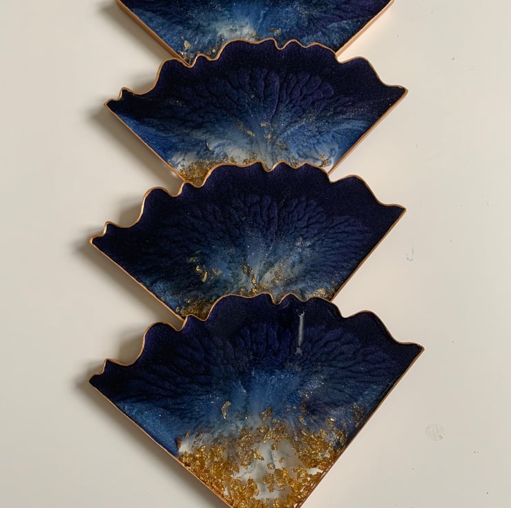 They are made with mica pigments and gold flakes. Each coaster is crafted to the highest standard and finished off with gold metallic edging paint.