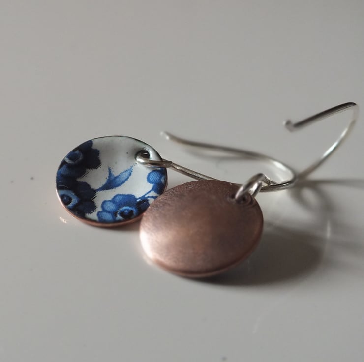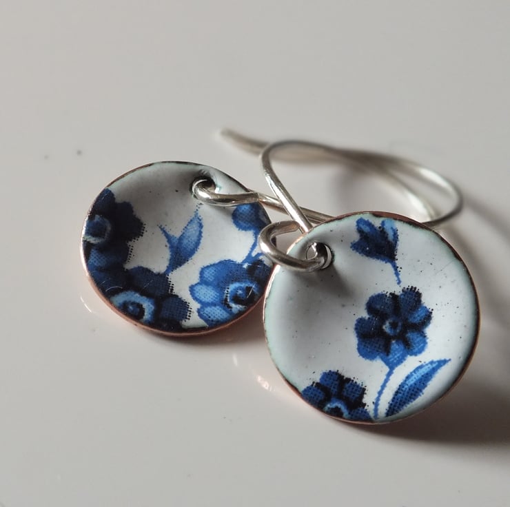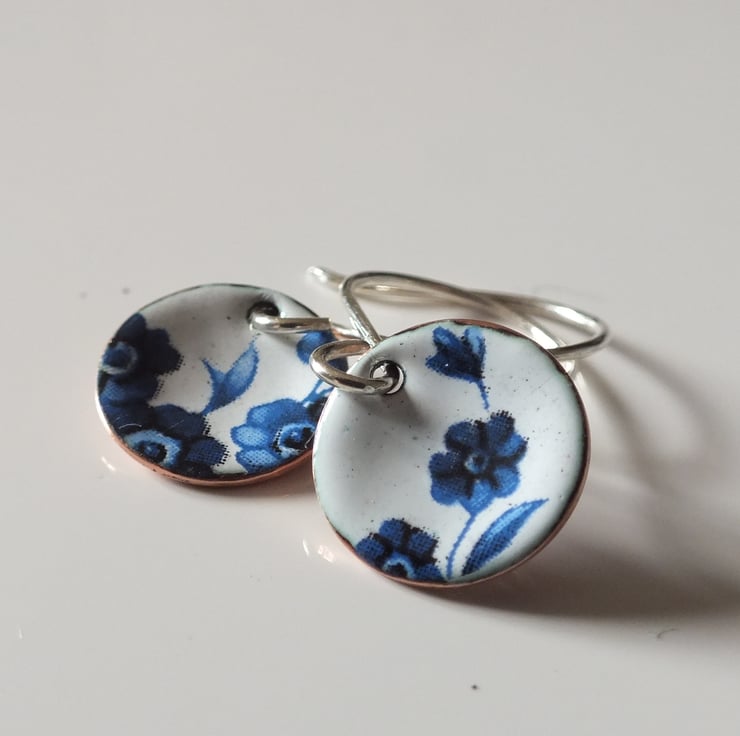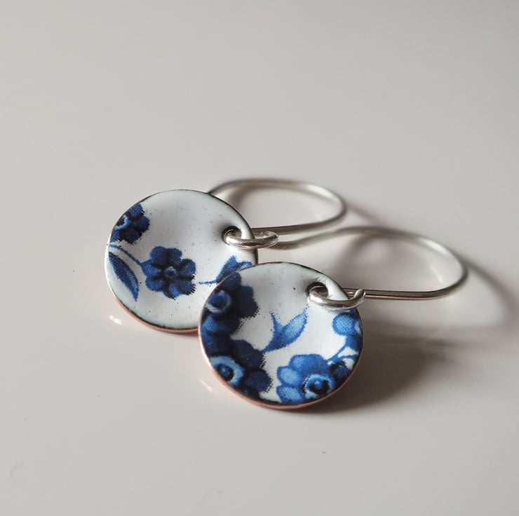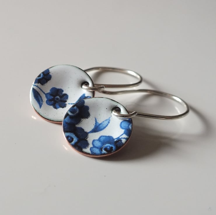White enamelled disk earrings, decorated with dark blue flowers. Each disk is slightly concave, measures 13mm in diameter and has a natural copper finish on the back. The earring wires are handmade from sterling silver.