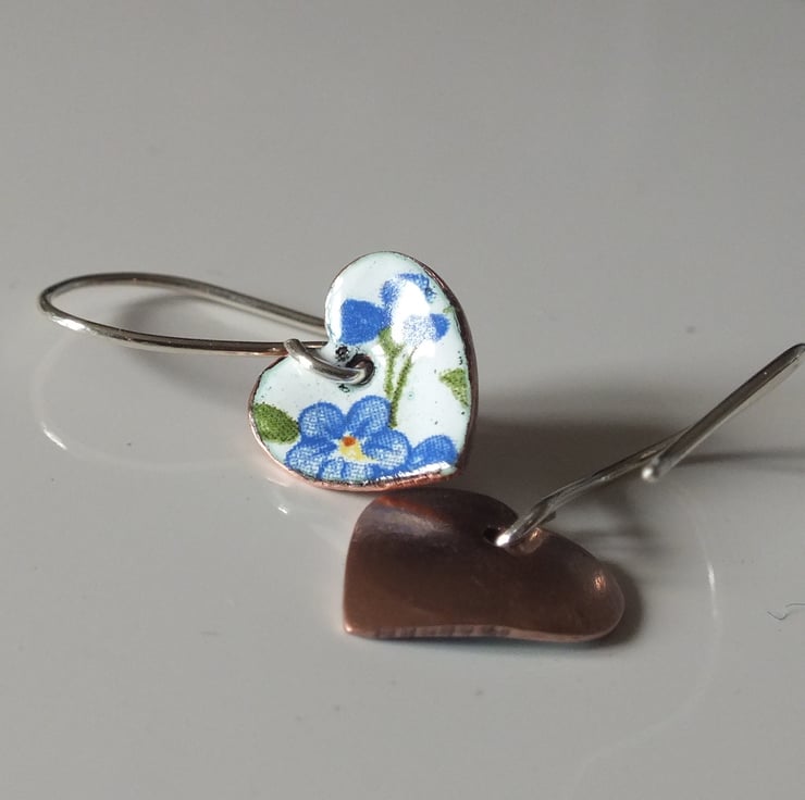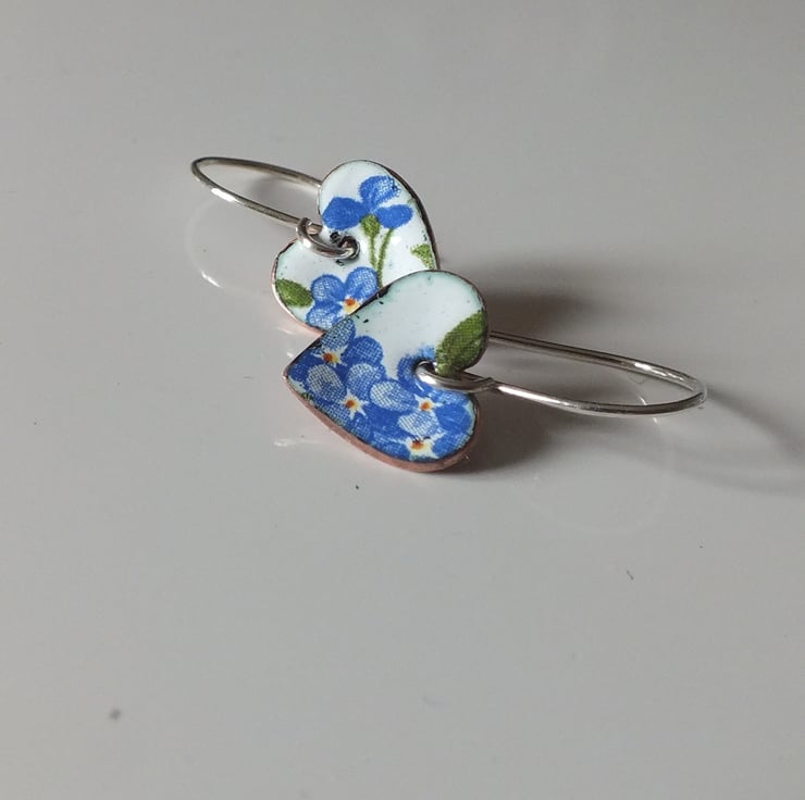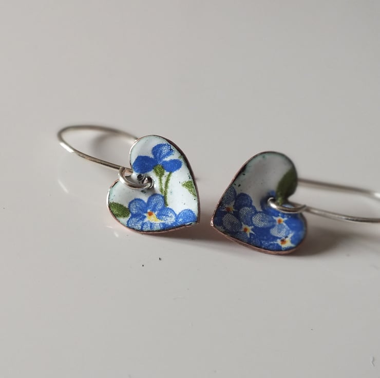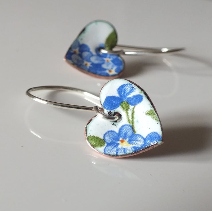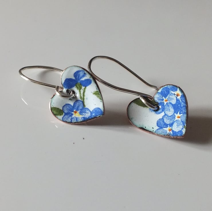 White enamelled heart shaped drop earrings, decorated with forget-me-nots, suspended from handmade sterling silver earring wires.