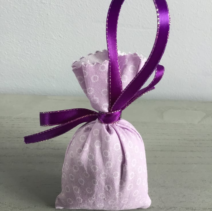 This lavender bag has a long hanging loop of purple satin ribbon, tied with a bow at the top. So it’s ready to hang on a coat hanger, over a door or cupboard handle. It’s 5 x 3 inches of cotton fabric and filled with lavender grown in my Yorkshire garden. Give the bag a scrunch..... and the lovely fresh lavender fragrance bursts out.