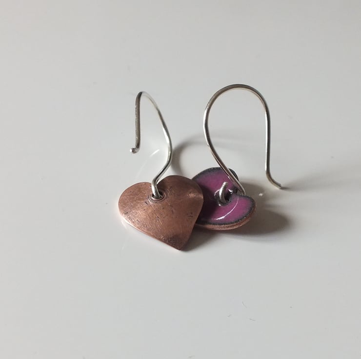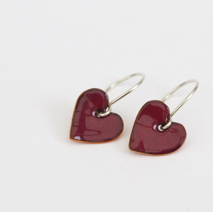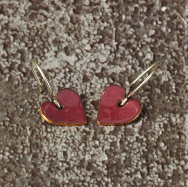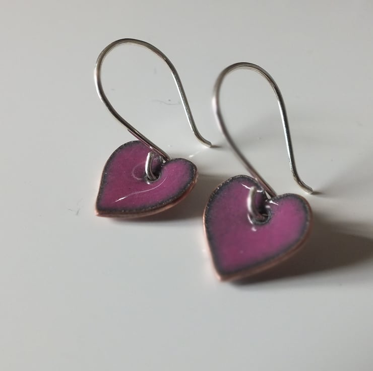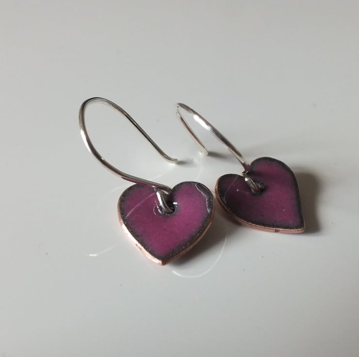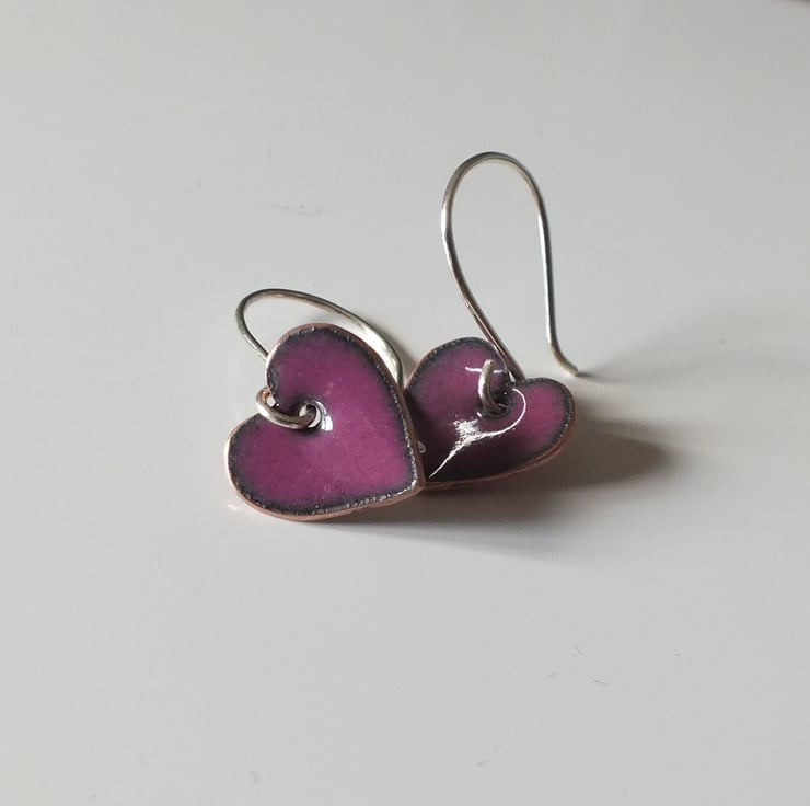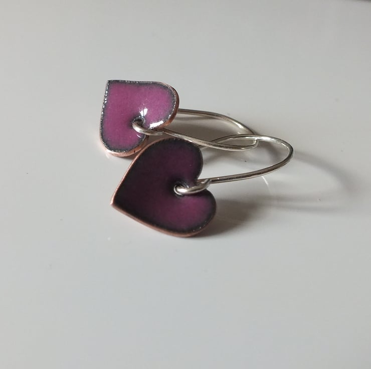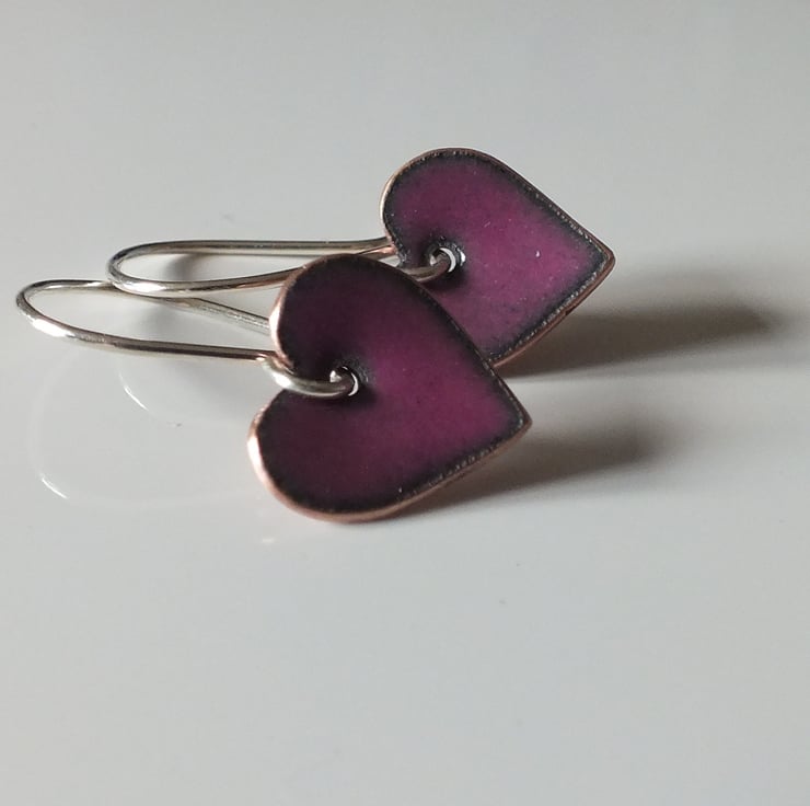 Purple enamelled heart shaped drop earrings, suspended from handmade sterling silver earring wires.
