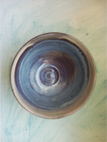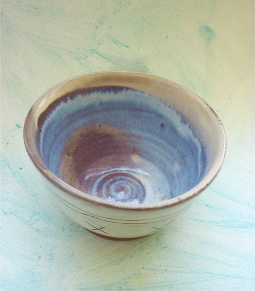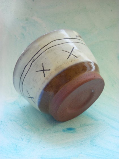 - Hand Thrown on the wheel using red earthernware clay. Inside is a blue white glaze and the outside features my sgraffito design.