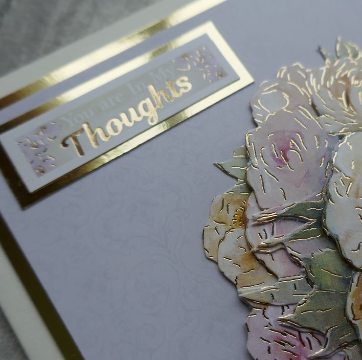 The flourishing florals decoupage image is from a design by Hunkydory. The vase of pale gold and pink flowers have been attached to a panel of card and gold mirri. The sentiment 'You are In My Thoughts' has been layered onto gold mirri and attached in the top corner.