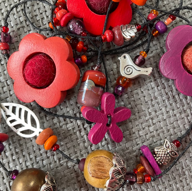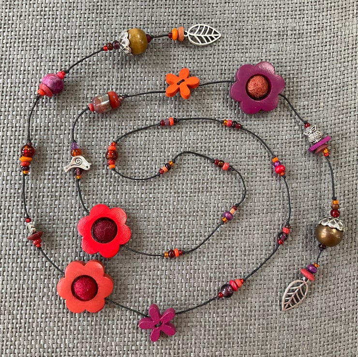 Lariat necklace featuring a glorious mixture of beads in shades of red, orange and berry. The beads include large painted wood flowers, felt balls, glass, recycled glass and wooden beads, antique silver tone flower, bird, leaf and owl beads. It is finished at the ends with antique silver tone acorn bead cups atop one wooden and one metal bead. The whole necklace is strung on a waxed linen thread. This necklace also features a special glass bead, handmade locally in Hampshire by Nadege de la Garde, which was the inspiration for this particular colour mix.