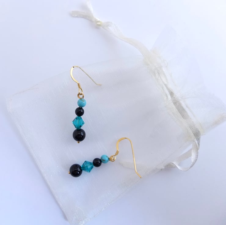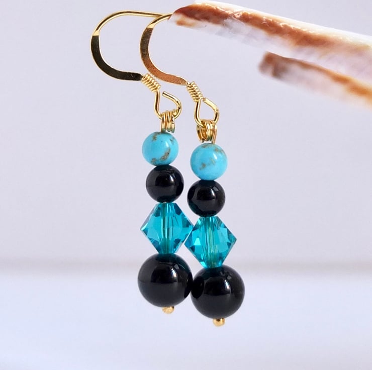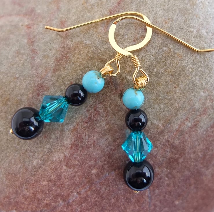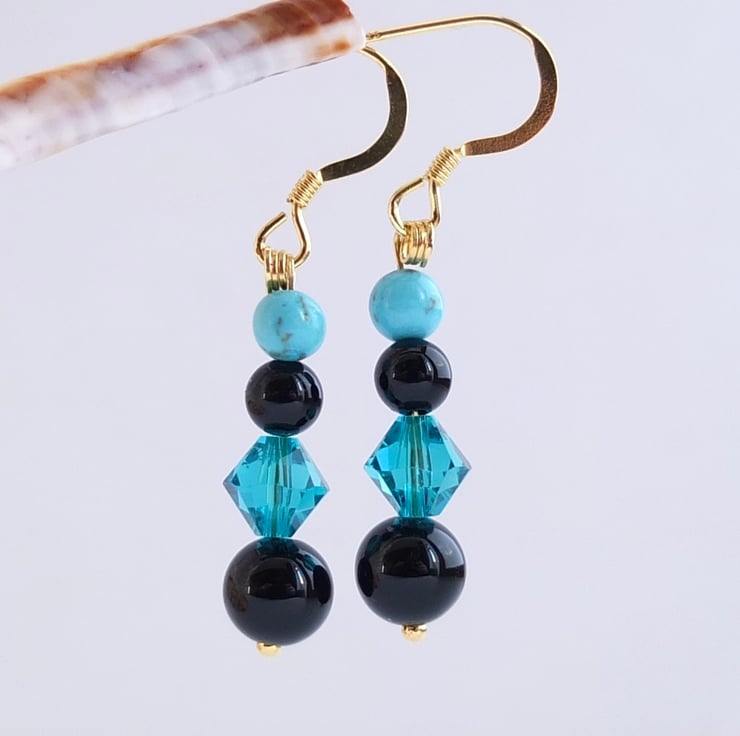A 6mm black onyx bead, 6mm sparkly Swarovski crystal in the colour "blue zircon", 4mm black onyx and 4mm turquoise howlite bead.