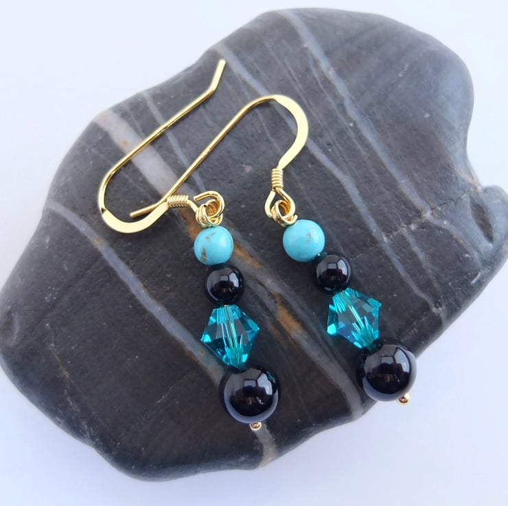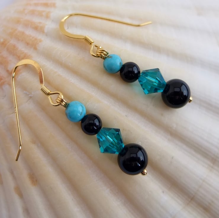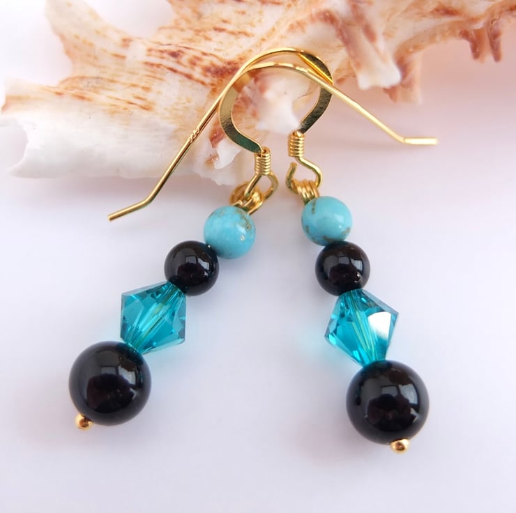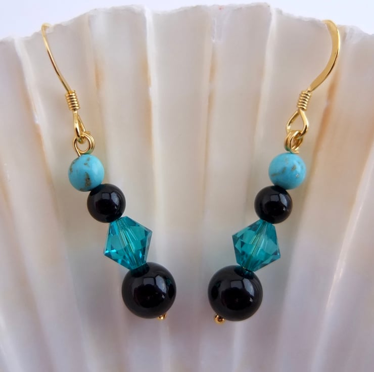 Swarovski crystals in blue zircon and turquoise-dyed howlite contrast well with black onyx beads.