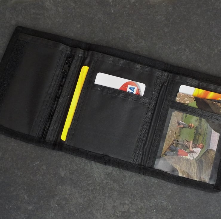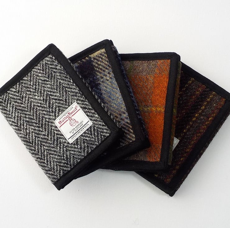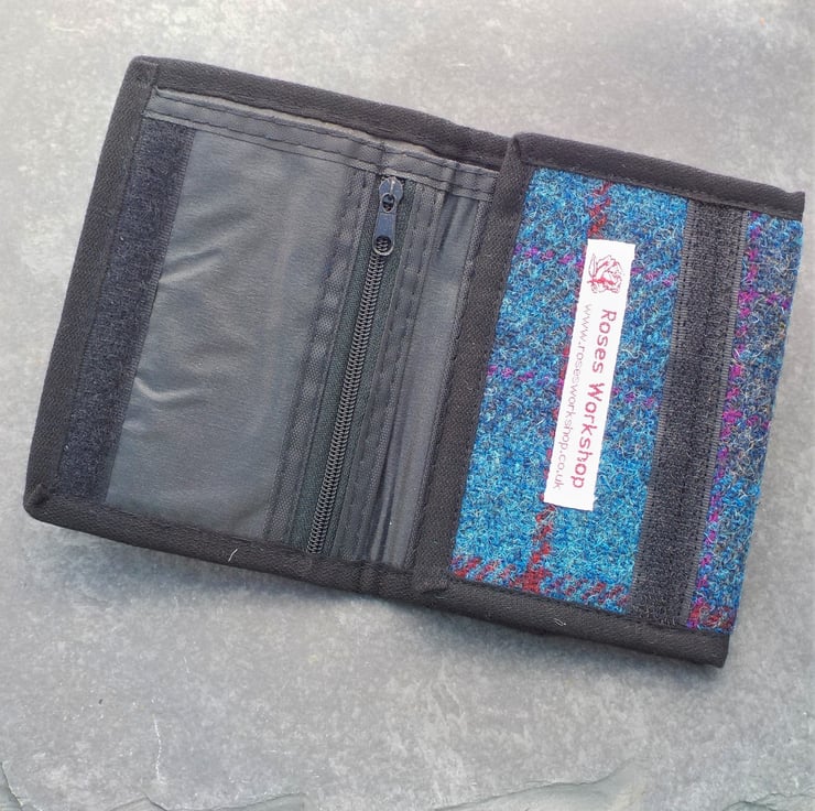 Harris tweed wallet in blue and purple tartan fabric billfold style. I have made this trifold wallet from hand-woven Harris tweed fabric in a blue and purple tartan design. The inside is nylon with lots of pockets for notes and cards. There is a small zipped pocket - please note this is for a small item such as a car-park token, and is not intended to hold large quantities of coins.