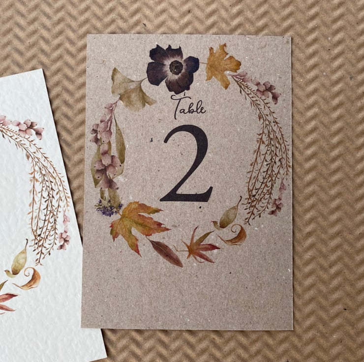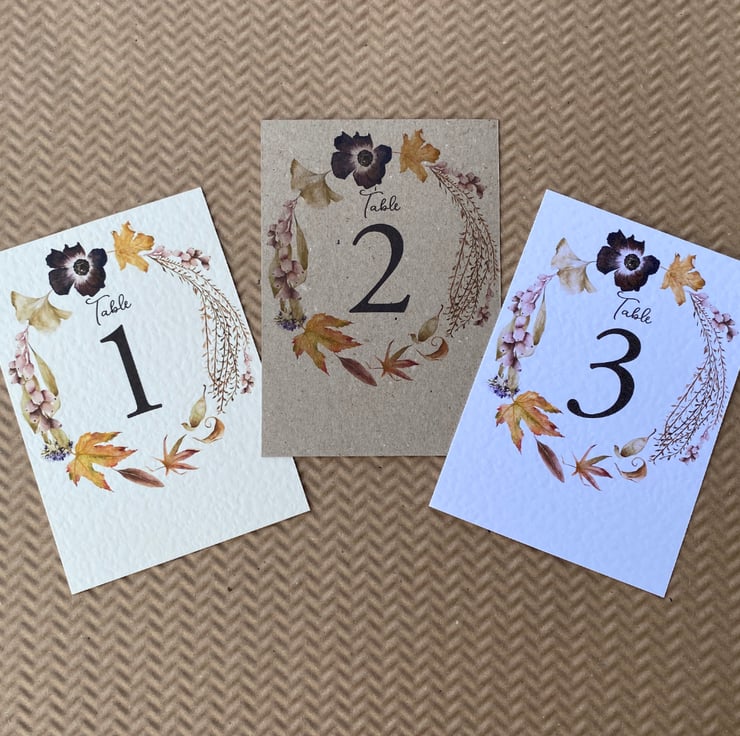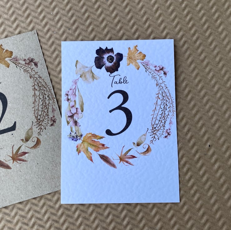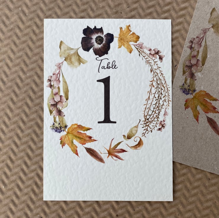 Autumn maple leaves wreath wedding TABLE NUMBERS gold floral rustic A6 card